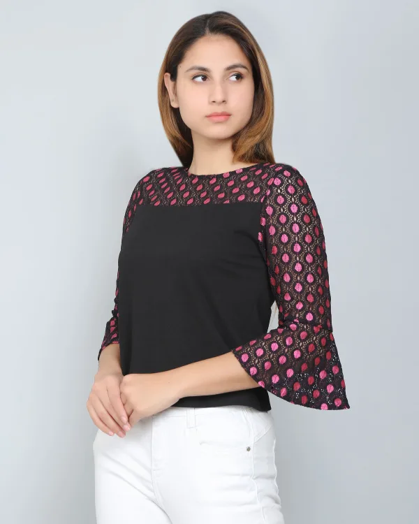 Pair the Black & Pink Colorblocked Lace Top with your favorite jeans for a chic, laid-back look, or tuck it into a high-waisted skirt for a more polished ensemble. Accessorize with statement earrings or a delicate necklace to complete your outfit, and you're ready to turn heads wherever you go.