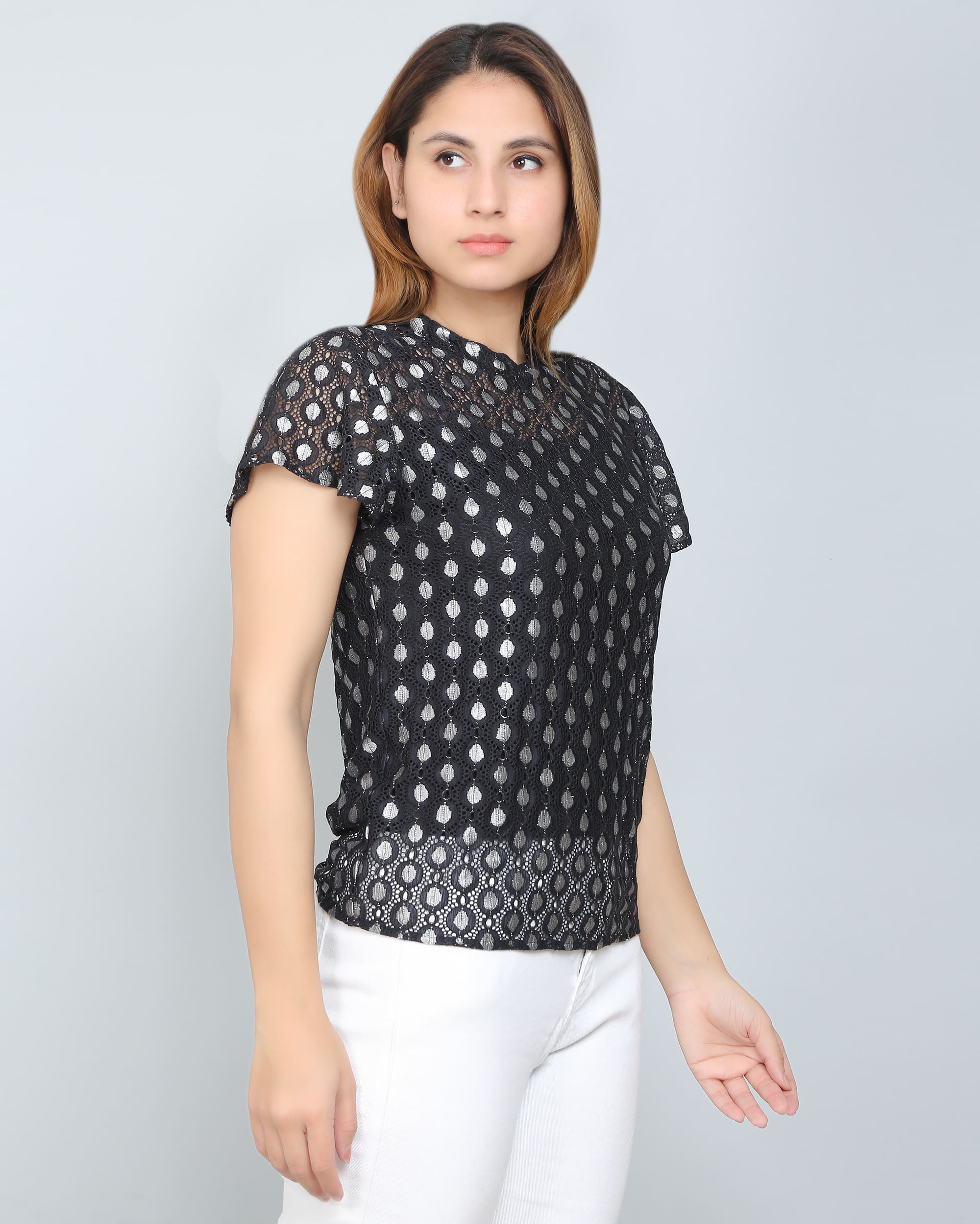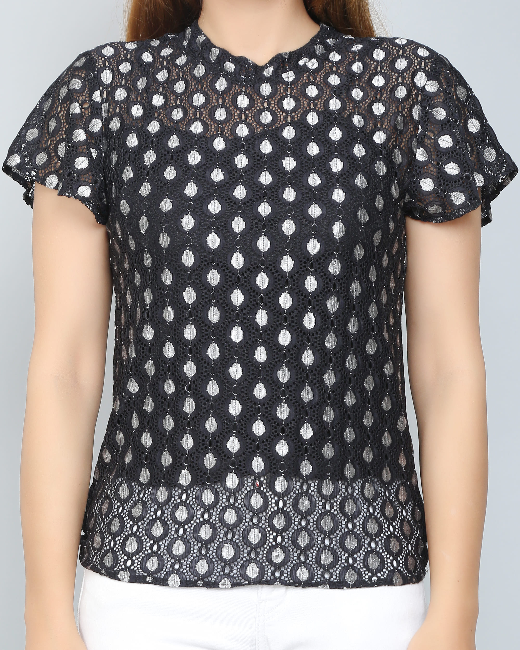 With its timeless design and flattering silhouette, the Black & Silver Self Design Lace Top is a must-have addition to your collection. Embrace your style and let this stunning piece be the highlight of your outfit!