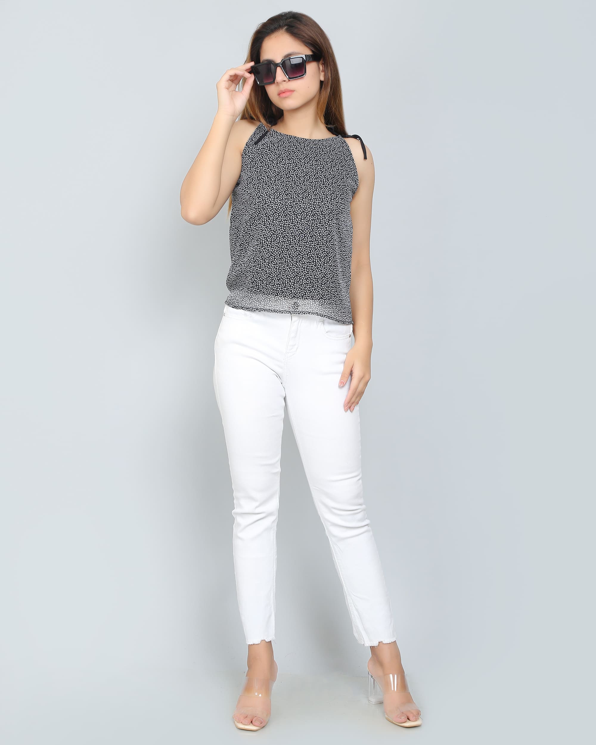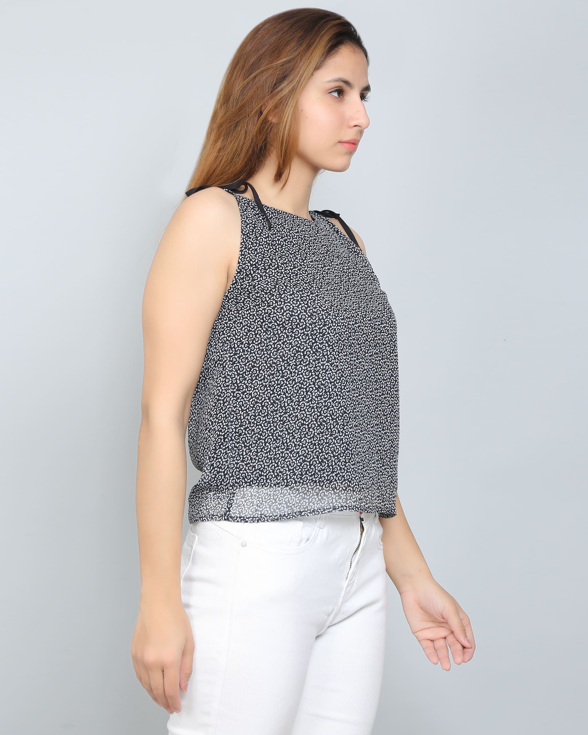 Black Ditsy Floral Tie-Up Top. Ditsy floral regular fit tie-up shoulder straps top with an attached lining inside to beat the transparency of the fabric. Ditsy floral never goes out of style and makes you look pretty every time you wear them. Black studs and black flats will suit this casual looking spaghetti strap top. This top has a regular fit.