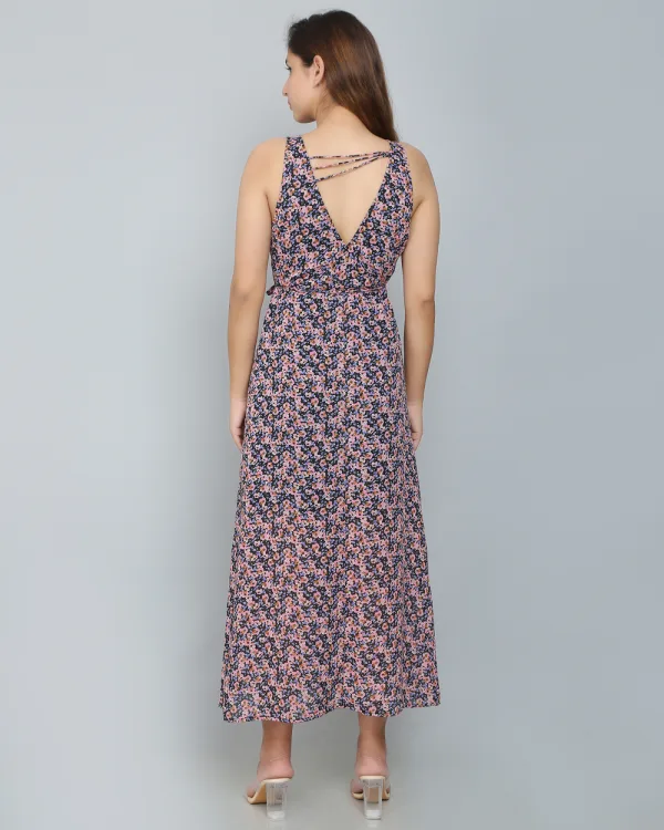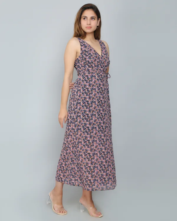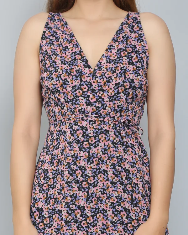 Available in various sizes, this Black Floral Sleeveless Wrap Dress is designed to flatter all body types. Embrace your style with this timeless piece that combines comfort, charm, and sophistication, making it a must-have addition to your wardrobe. Transform your look and feel confident in any setting with this beautiful dress!