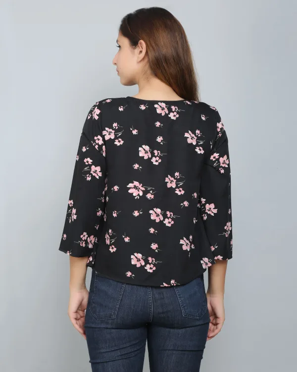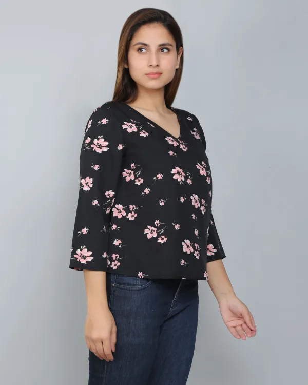 Introducing our beautiful Black Floral V-Neck Top, a versatile addition to your wardrobe that effortlessly combines style and comfort. This top features a stunning floral pattern set against a classic black background, making it perfect for both casual outings and more polished occasions.