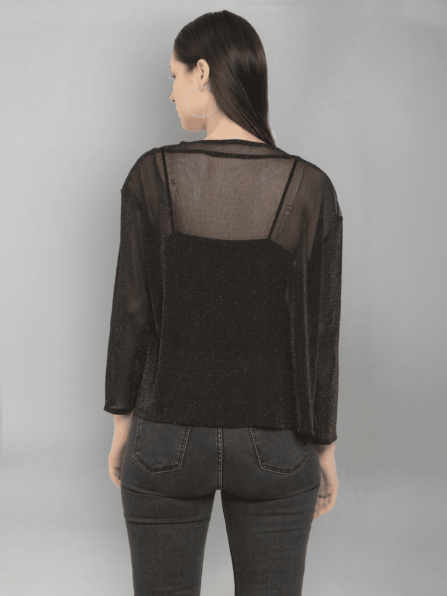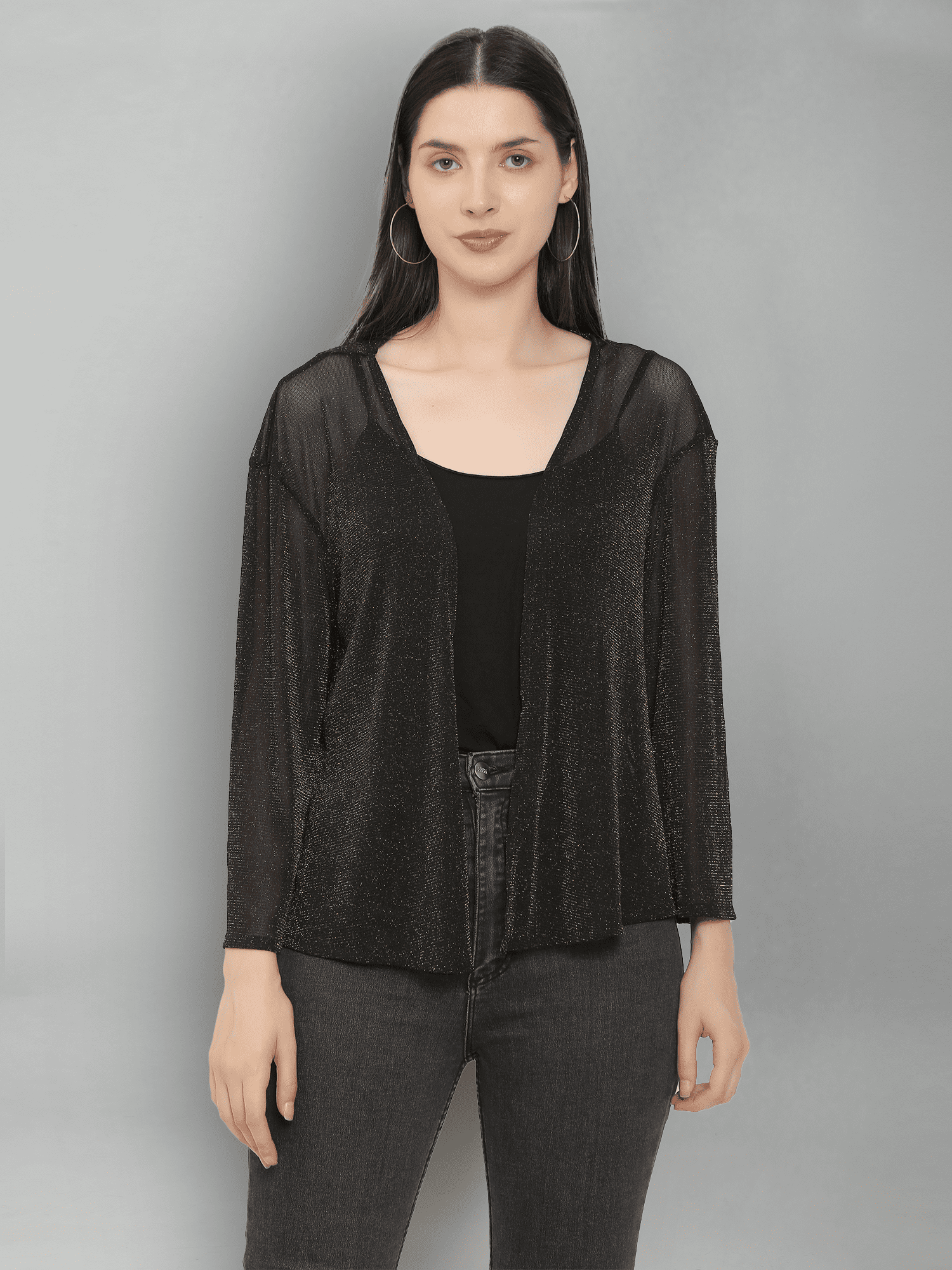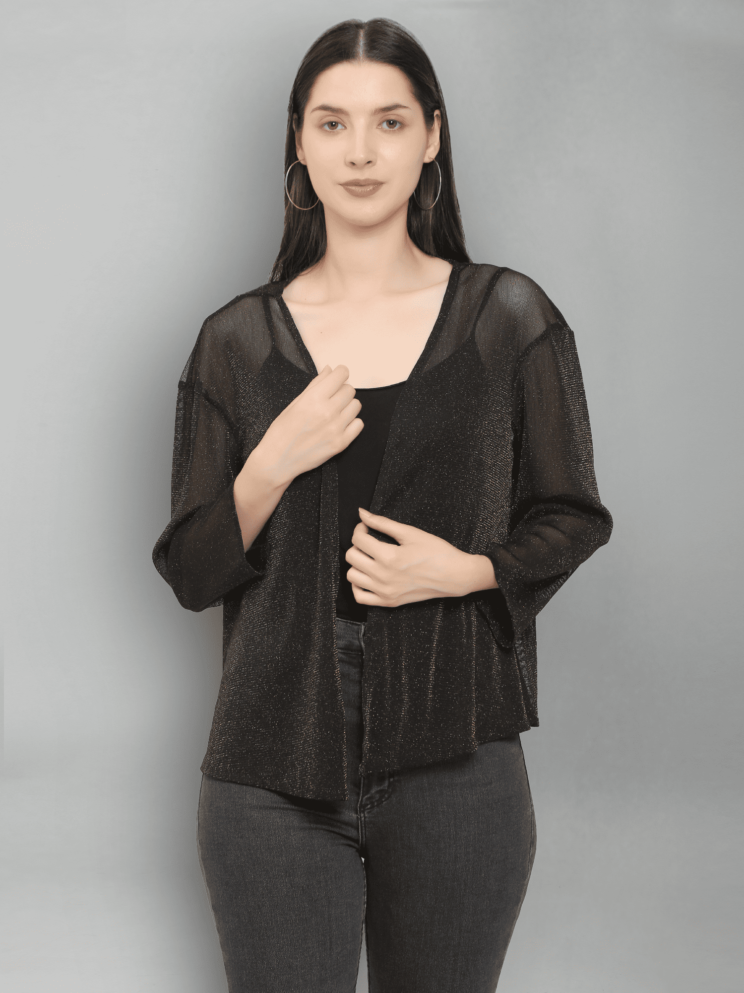With its easy-to-wear design and sophisticated look, the Black Shimmer Mesh Party Shrug is an essential addition to your wardrobe. Elevate your outfit and embrace the allure of shimmering details—perfect for making a statement at your next event!