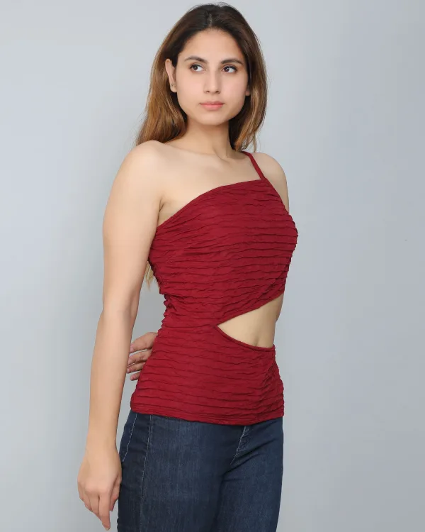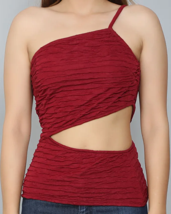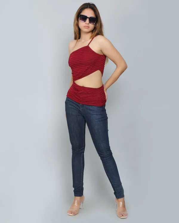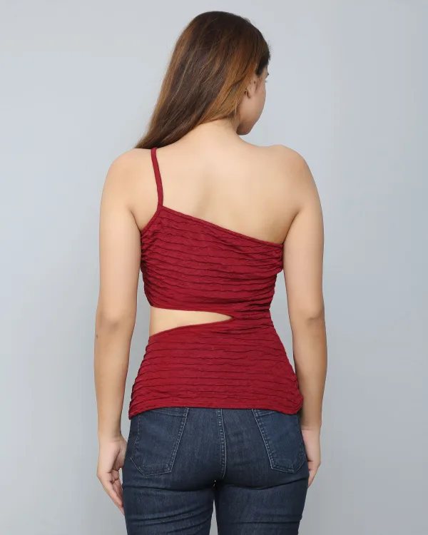 I found the Burgundy Self-Design Frill Cut-Out Top to be quite unique. The frill and cut-out details add an interesting touch, and the color is a nice deep burgundy.