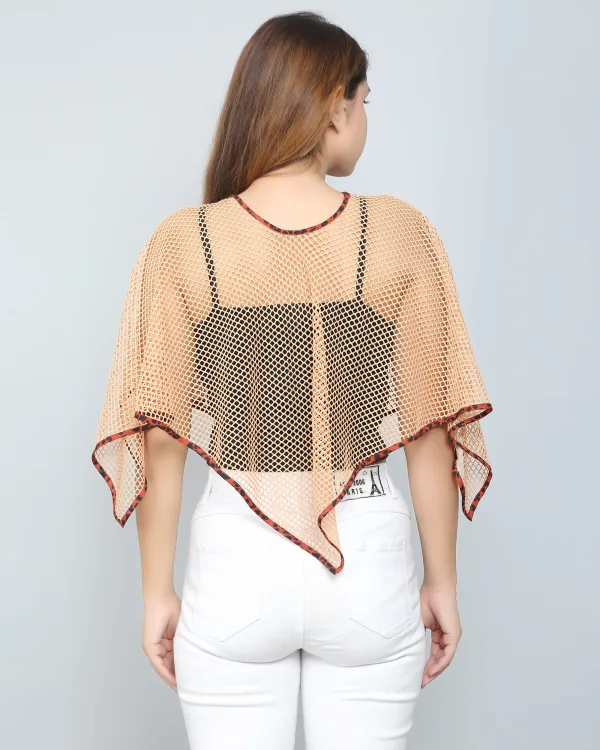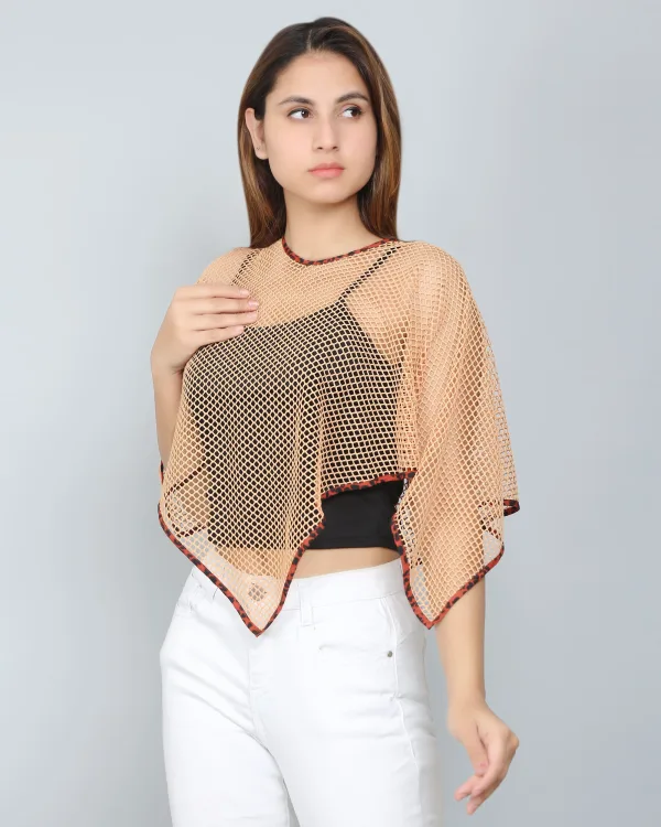 This dark beige stylish net poncho top is a perfect combination of elegance and ease. Crafted from lightweight, breathable net fabric, it drapes effortlessly over the body, offering a relaxed yet sophisticated silhouette. The poncho design features wide, flowing sleeves and an asymmetrical hemline, adding a boho-chic flair to any outfit. Its neutral dark beige hue makes it a versatile piece, easily paired with a variety of colors and styles. Whether layered over a cami for a casual daytime look or dressed up with accessories for an evening out, this poncho top brings effortless style and comfort to your wardrobe.