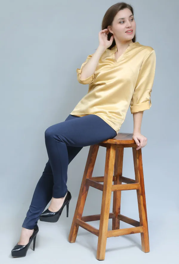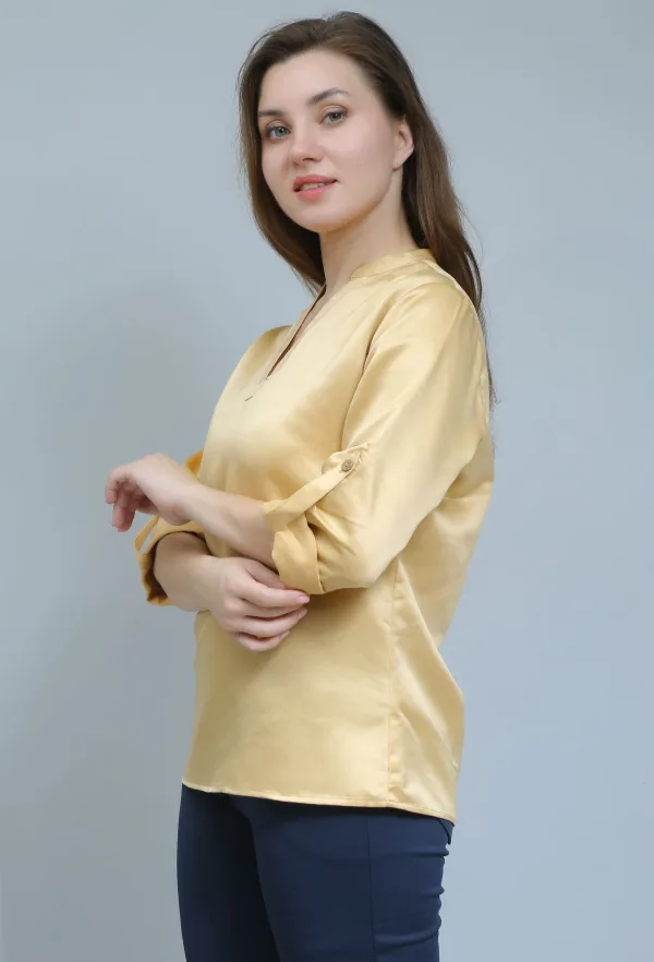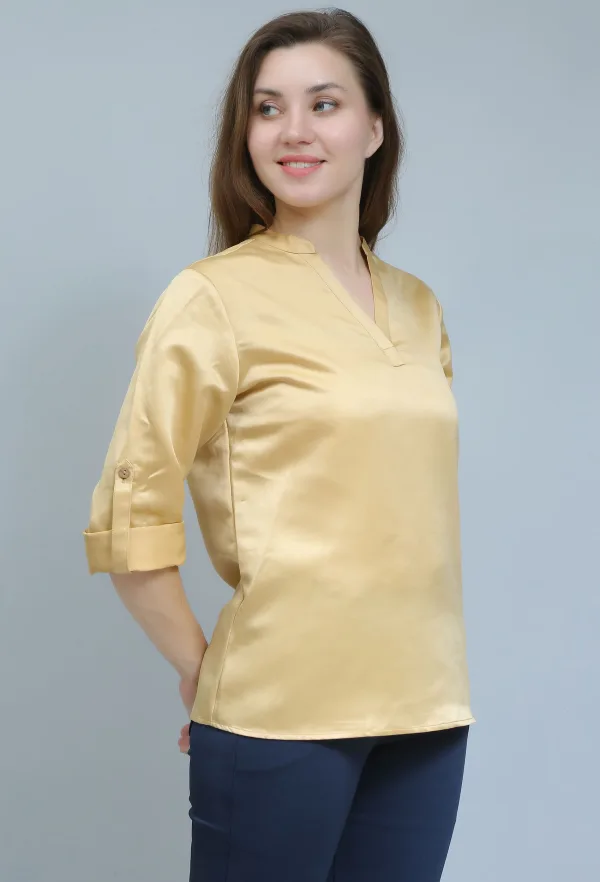 This golden satin shirt adds a touch of elegance to my semi-formal wardrobe. Absolutely love the sheen and fit!"