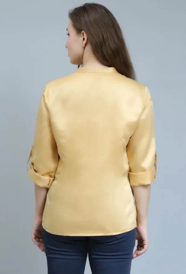 Introducing our Golden Satin Semi-Formal Shirt, a luxurious addition to your wardrobe that effortlessly blends style and sophistication. Crafted from high-quality satin, this shirt features a smooth, glossy finish that catches the light beautifully, making it perfect for both professional settings and special occasions.