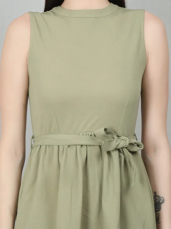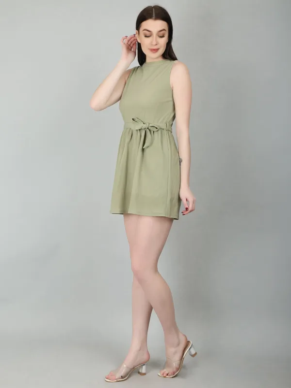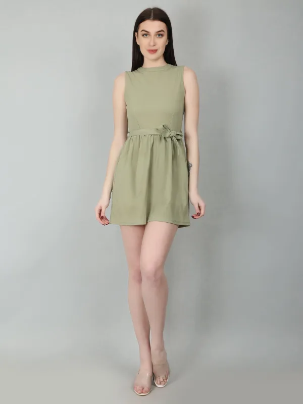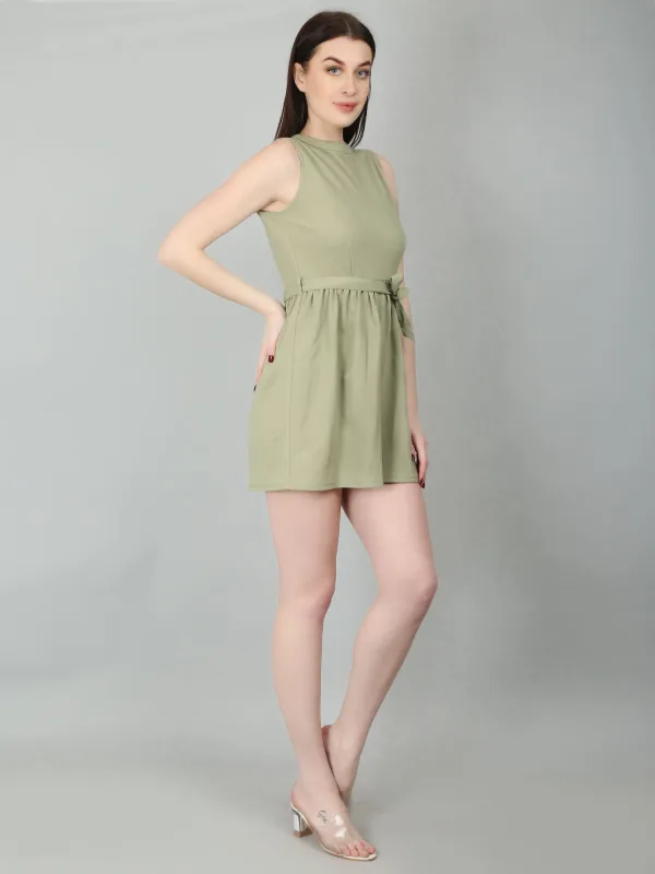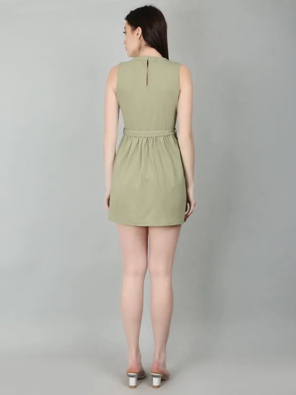The Green Sleeveless Mini Dress is a stylish and versatile choice for various occasions. This sea green dress features a fit-and-flare silhouette with gathers at the waist, creating a flattering shape. It comes with a removable belt made from the same fabric, adding a touch of elegance. The back keyhole opening with a loop and button adds subtle detail, while the regular fit ensures comfort.