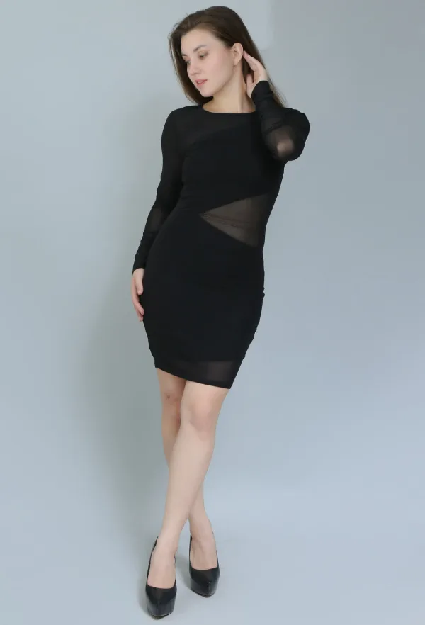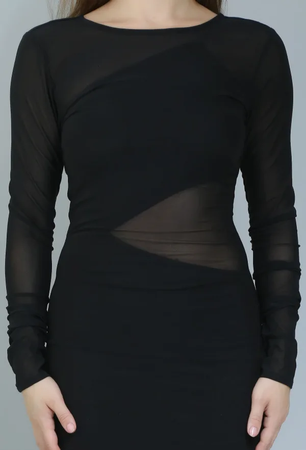 The unique design details, including the mesh inserts, add an edgy touch while maintaining an air of elegance. Pair it with your favorite heels and statement jewelry to complete the look, or layer it with a chic jacket for a more polished appearance.