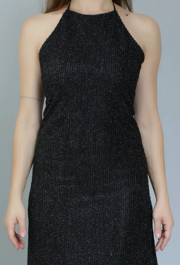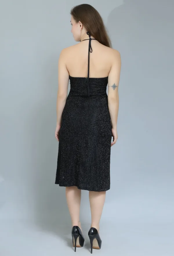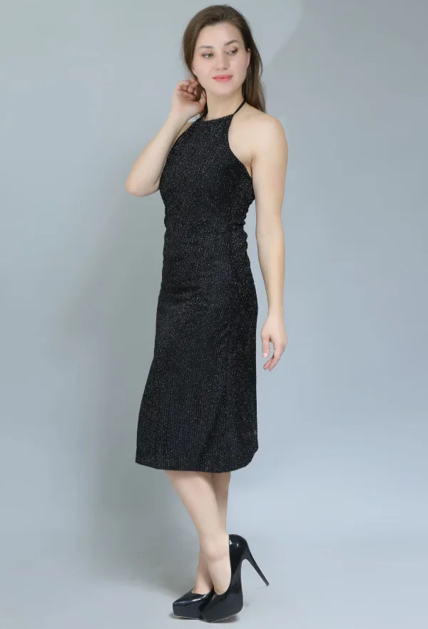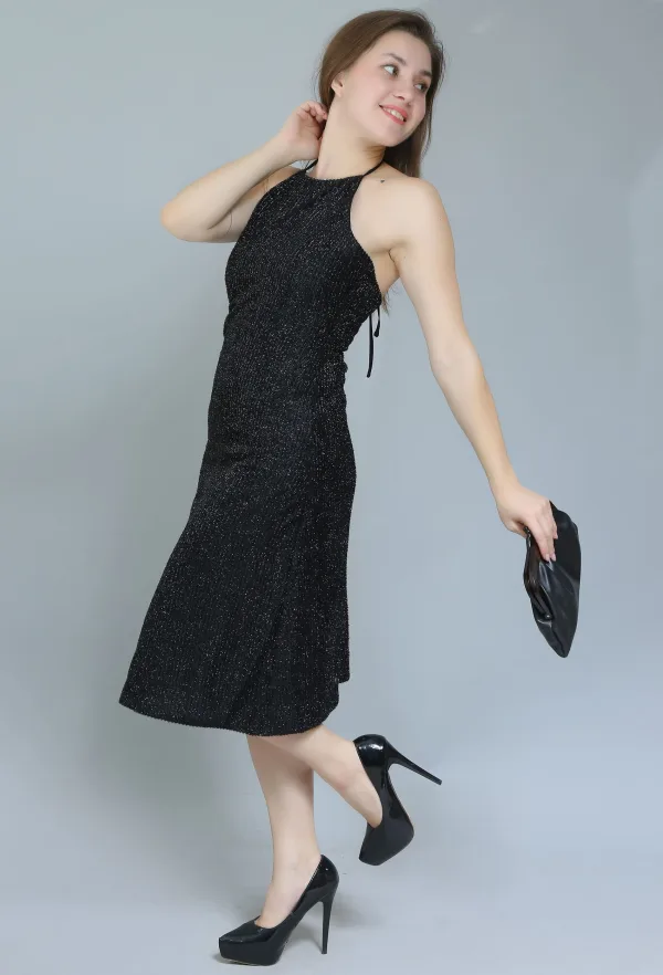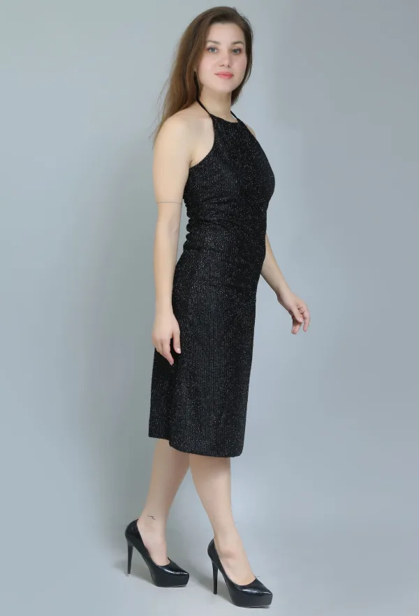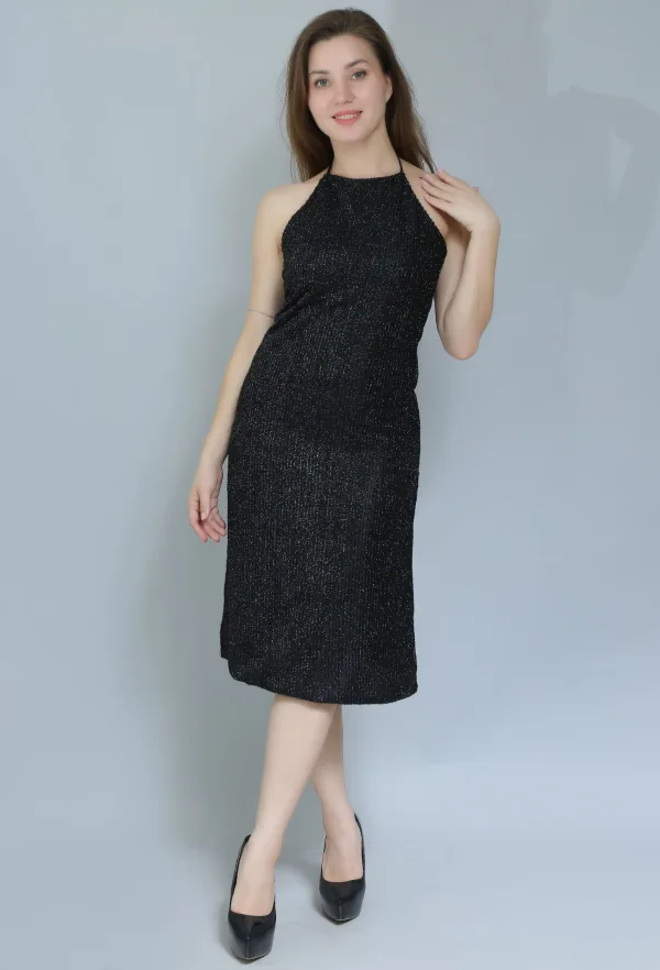 Introducing our stunning Black Self Design Halterneck Dress, a perfect blend of elegance and modern style. This exquisite dress is designed for those who want to make a bold statement while exuding confidence and sophistication. The halterneck design not only enhances your shoulders but also offers a flattering silhouette that beautifully frames your neckline.