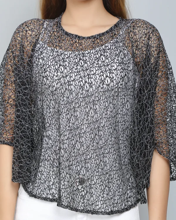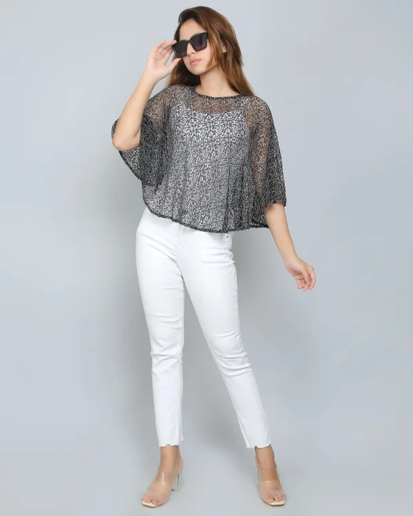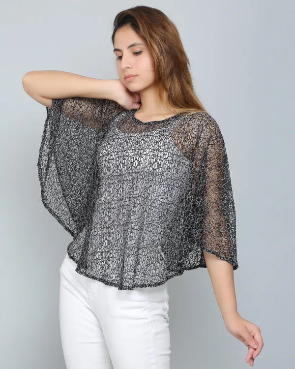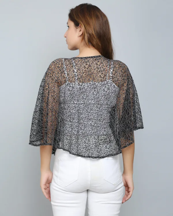 This Black Self Design Lace Poncho is an elegant and versatile layering piece. Crafted from delicate lace with an intricate self-design pattern, it exudes sophistication and timeless style. The loose, flowing silhouette drapes beautifully over any outfit, while the soft, breathable fabric ensures comfort. Perfect for adding a touch of femininity to casual or evening ensembles, this poncho features a round neckline and open sides, making it easy to slip on. Whether paired with dresses or trousers, it effortlessly elevates your look with a chic and graceful finish. Ideal for any occasion needing a touch of glamour.