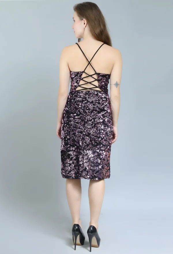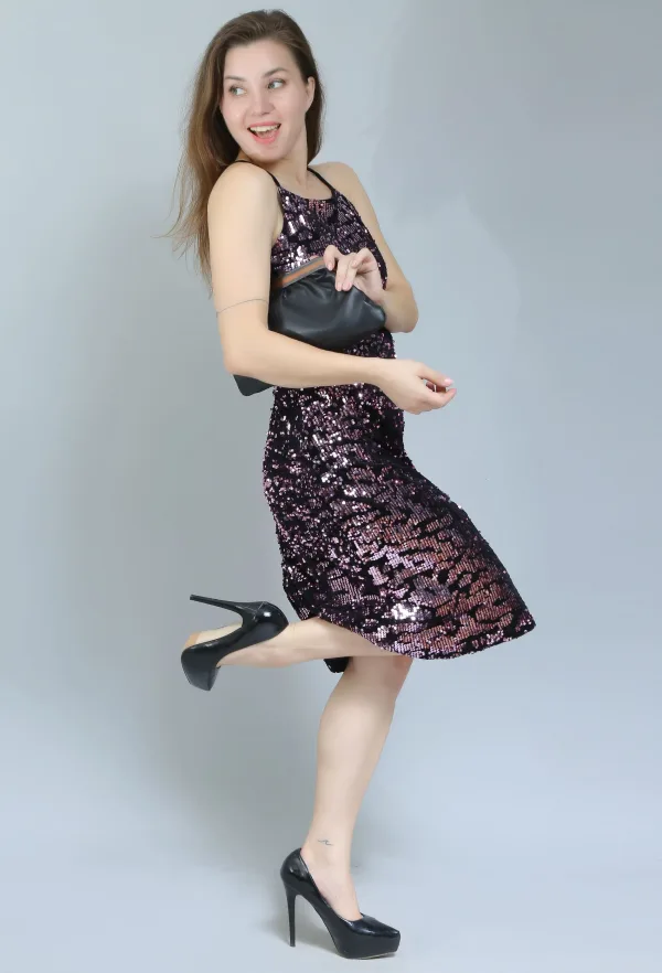 The striking sequined detailing adds a touch of sparkle, making it perfect for evening events, cocktail parties, and special occasions. Each sequin catches the light, creating a mesmerizing shimmer that will ensure all eyes are on you. The classic black color lends an air of sophistication, making this dress a timeless addition to your wardrobe.
