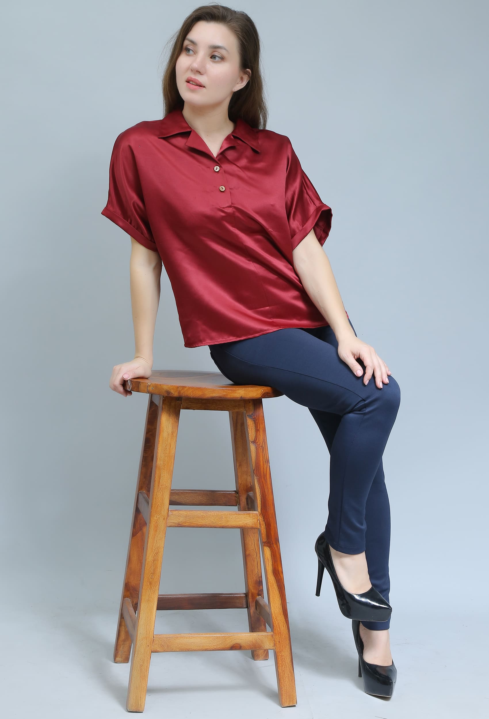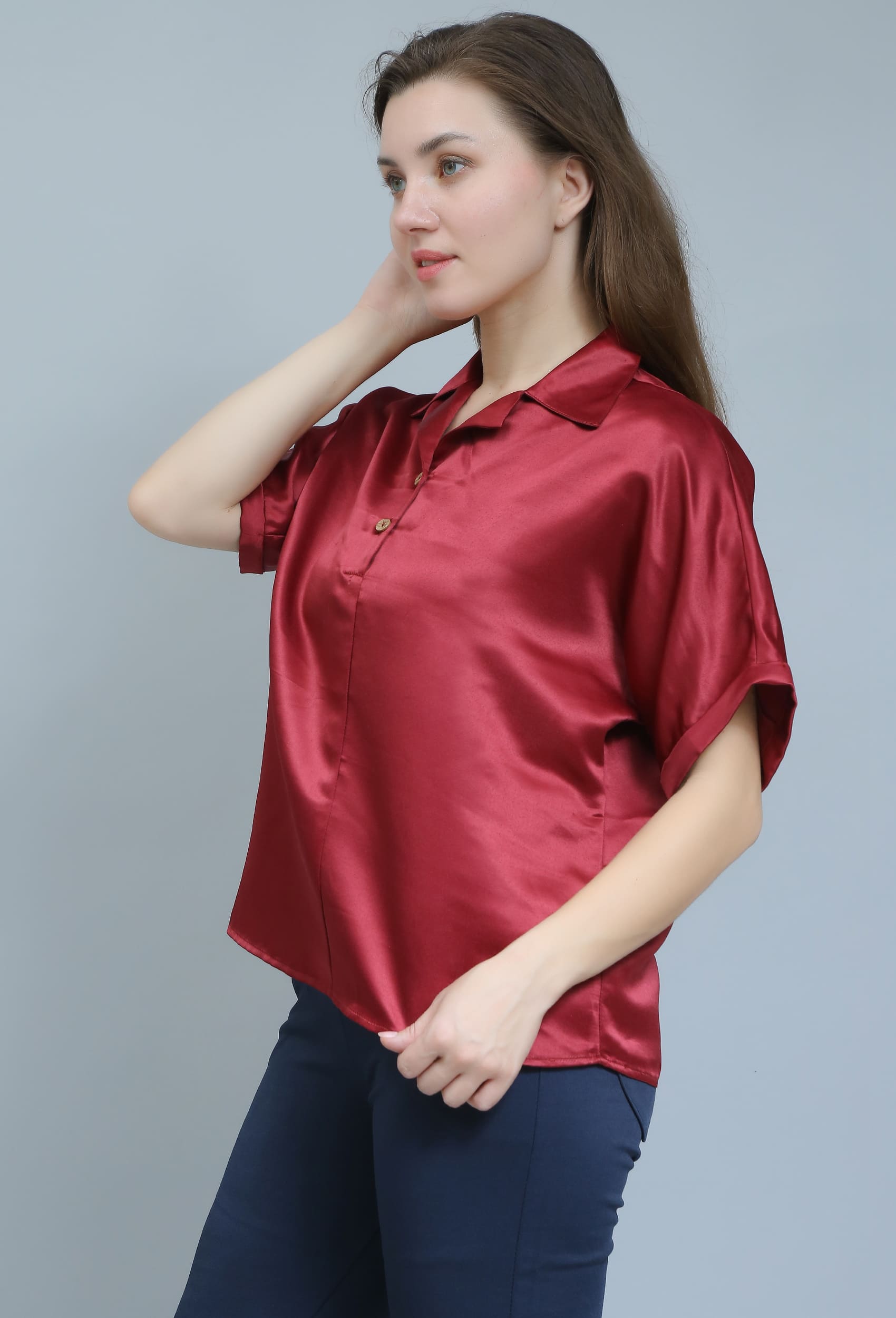 "I love how this shirt drapes. The satin material is really soft against the skin."