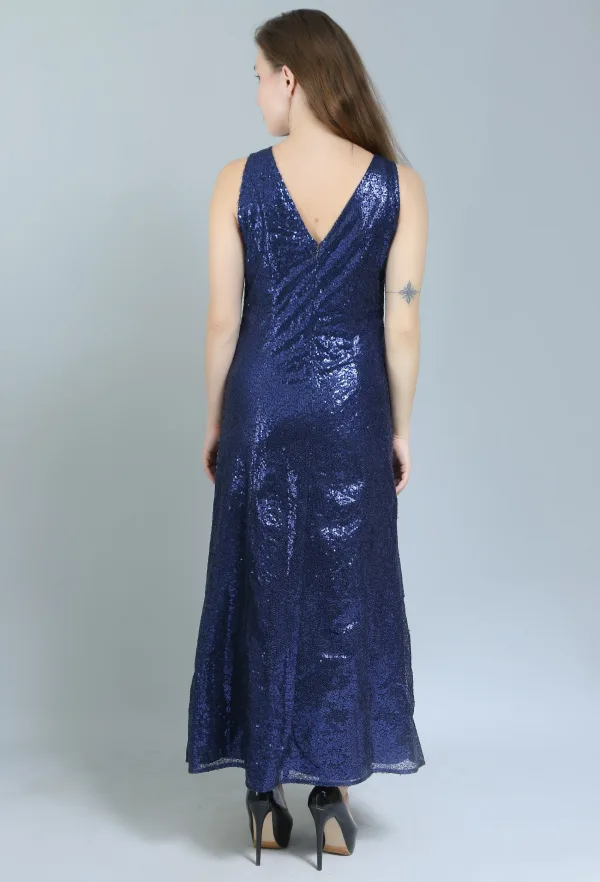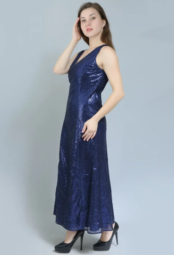 Introducing our exquisite Navy Sequinned Partywear Gown, the ultimate choice for those who want to make a grand entrance at any event. This stunning gown features an all-over sequinned design that sparkles beautifully, ensuring you capture the spotlight wherever you go.