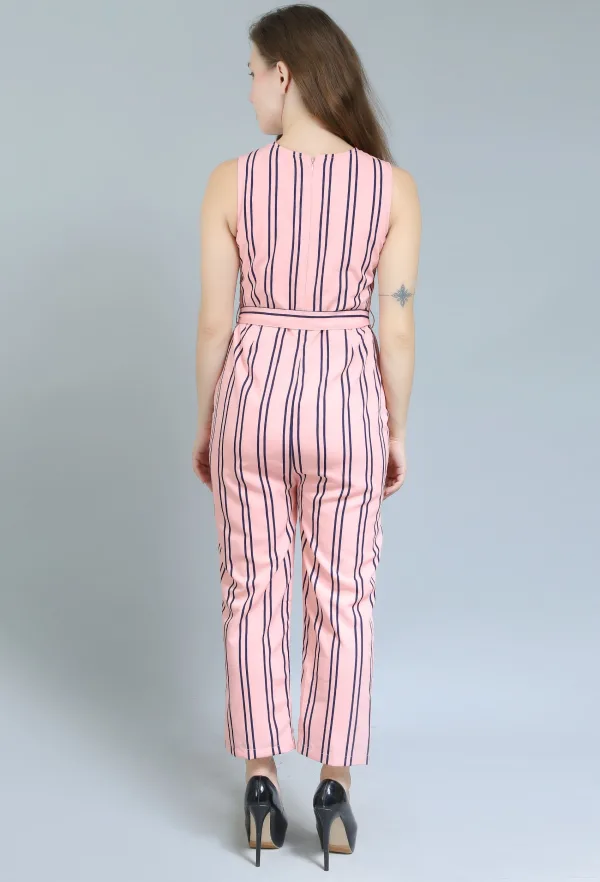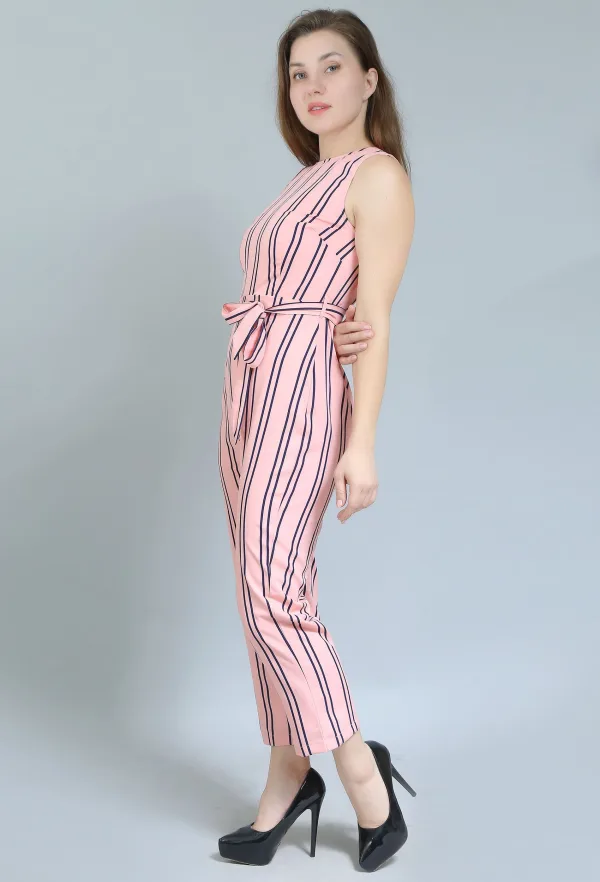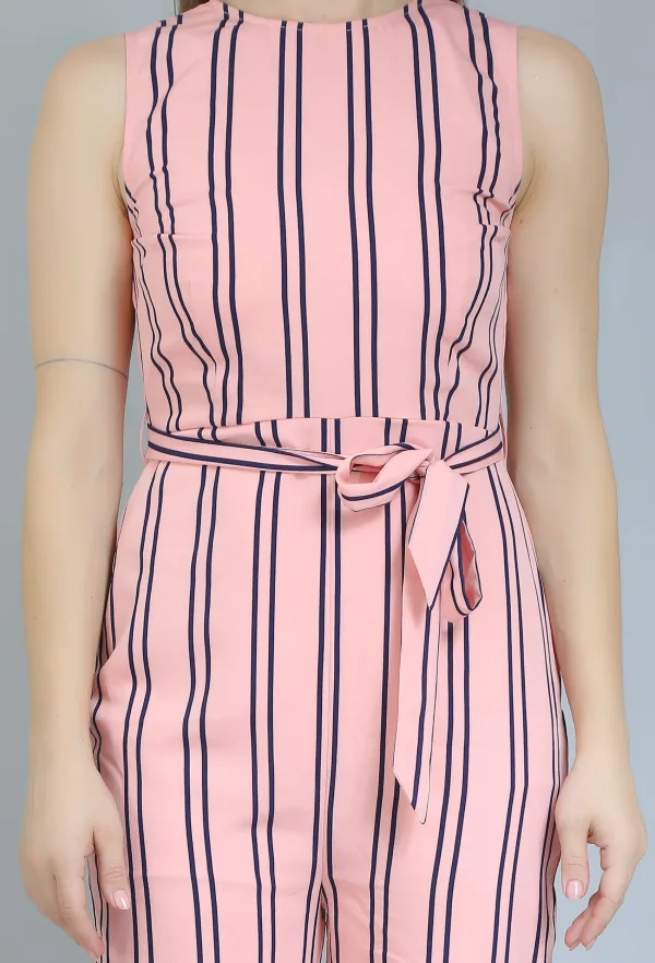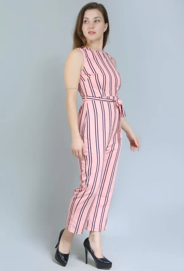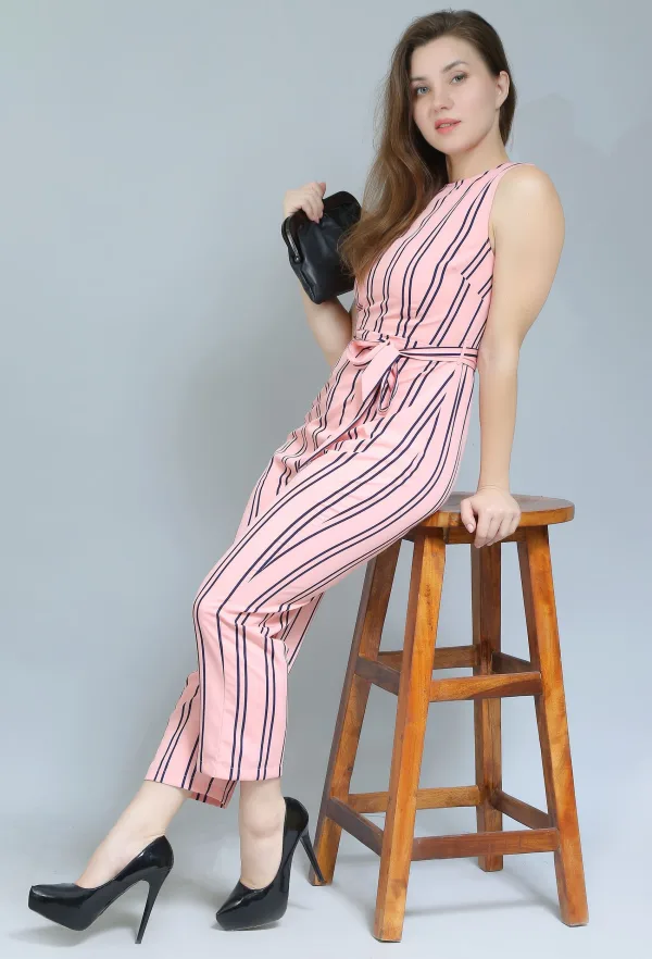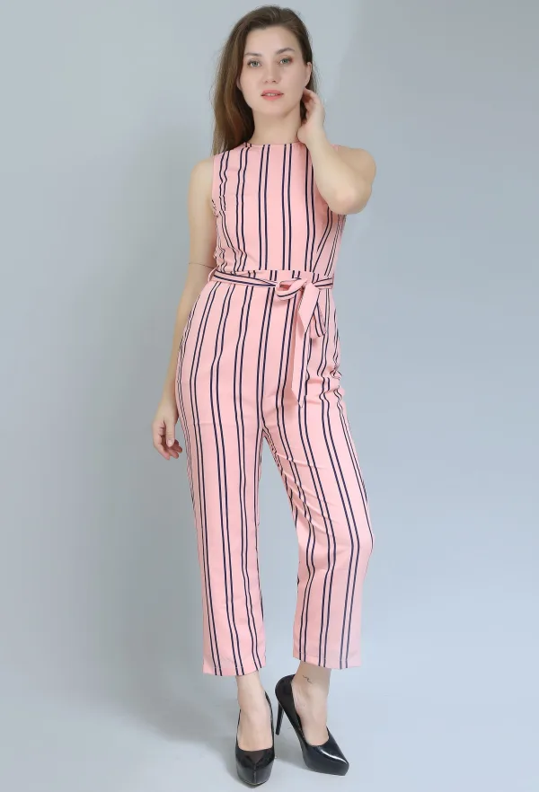 Vertical striped casual long jumpsuit with crew neck and removable belt made from the same fabric. It has an attached lining inside and a concealed zipper opening on the center back. This dress is sleeveless and has a slim fit.Jazzlr peach colour striped design sleeveless comfortable western wear jumpsuit for women & girls, which can be worn as a western outfit. Wear it with western jewellery for a western look and the back neck with zipper opening and it is comfortable to wear. The fabric material is 100% polyester in this attractive colour ready-to-wear jumpsuit. We will make sure that the fitting of this beautiful readymade jumpsuit looks good on your curves.