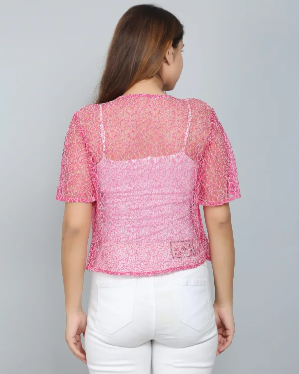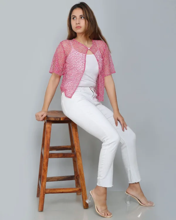 Don’t miss out on the opportunity to enhance your style with this elegant Pink Self Design Lace Shrug. Shop now and embrace effortless sophistication in your wardrobe!