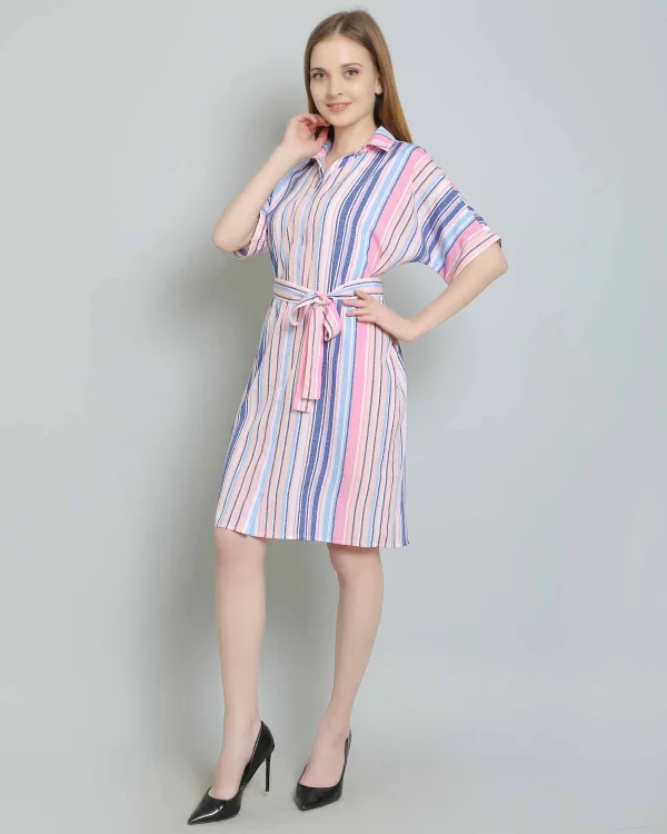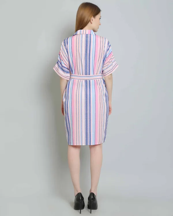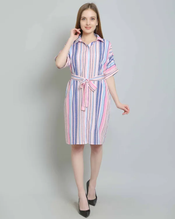 Introducing the Multicolor Striped Belted Shirt Dress, a vibrant and stylish addition to your wardrobe that effortlessly blends comfort with contemporary flair. This dress features an eye-catching array of stripes in a range of cheerful colors, making it perfect for brightening up your day.