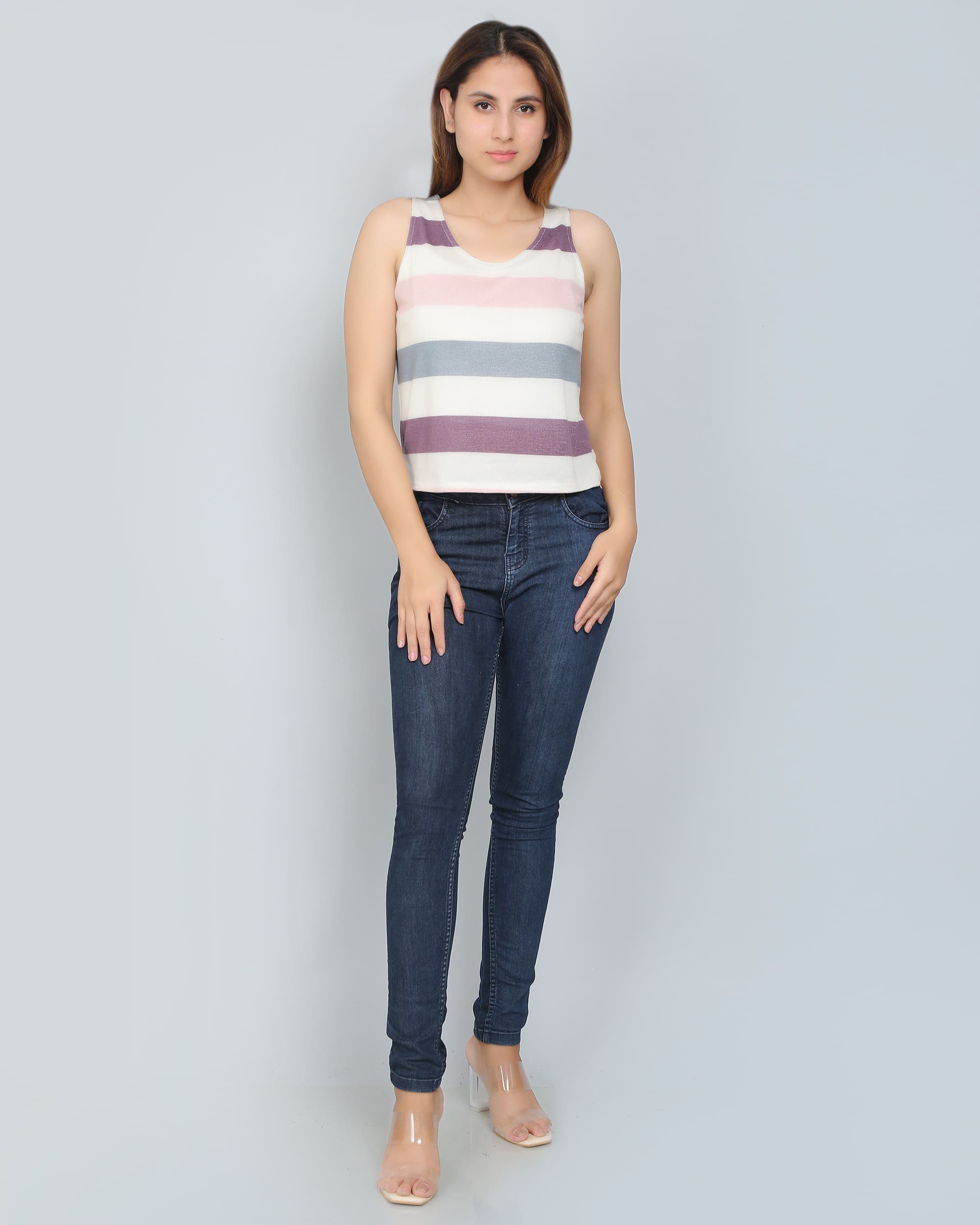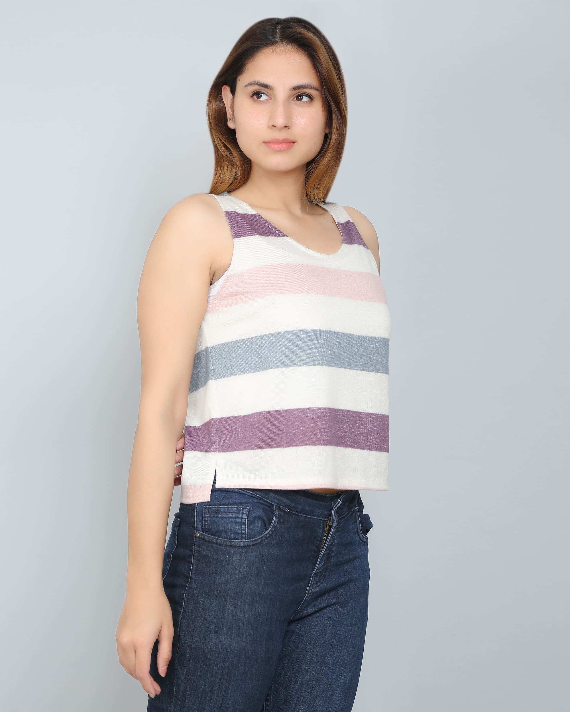 Multicolor Striped Tank Top Horizontally multicolor striped soft feel sleeveless tank top with bottom side slit and scoop neckline. This top is soft to touch. The colorful theme of this top is suitable for a day look with minimal accessory. It has a regular fit. High-low design of this top comes with a side slit on both sides.