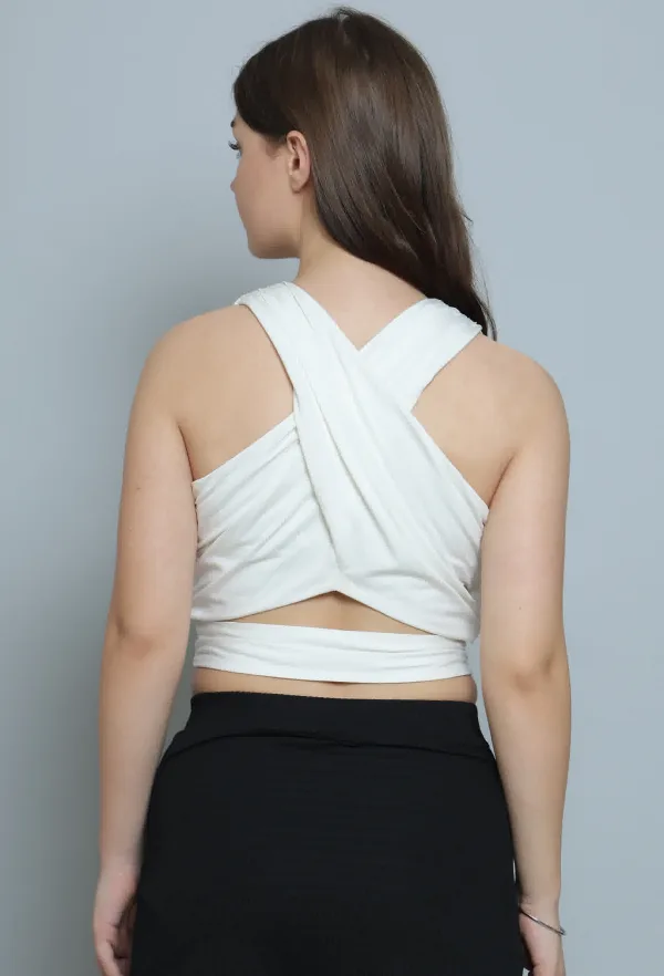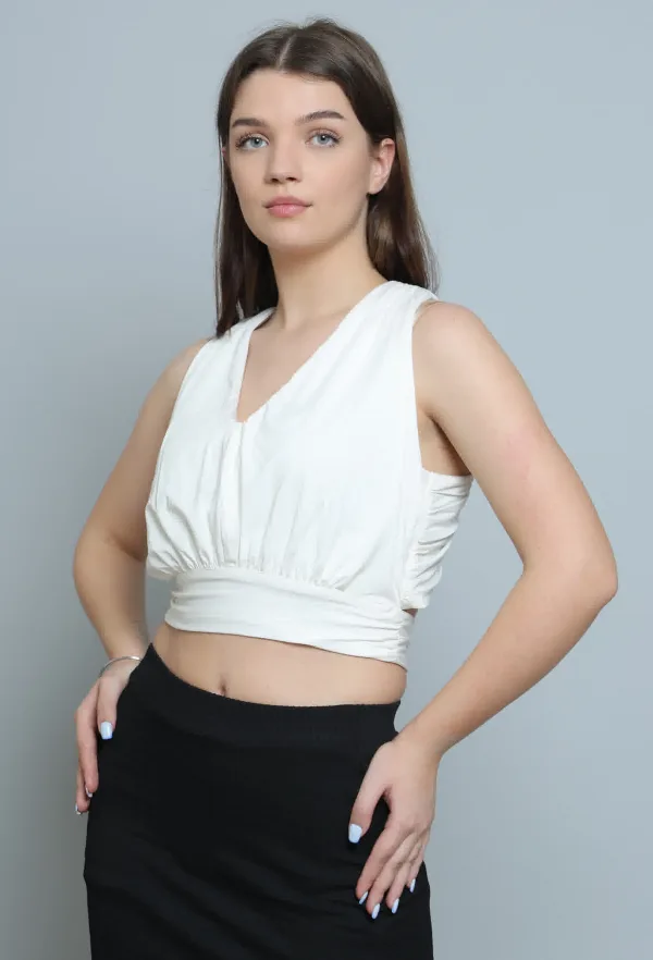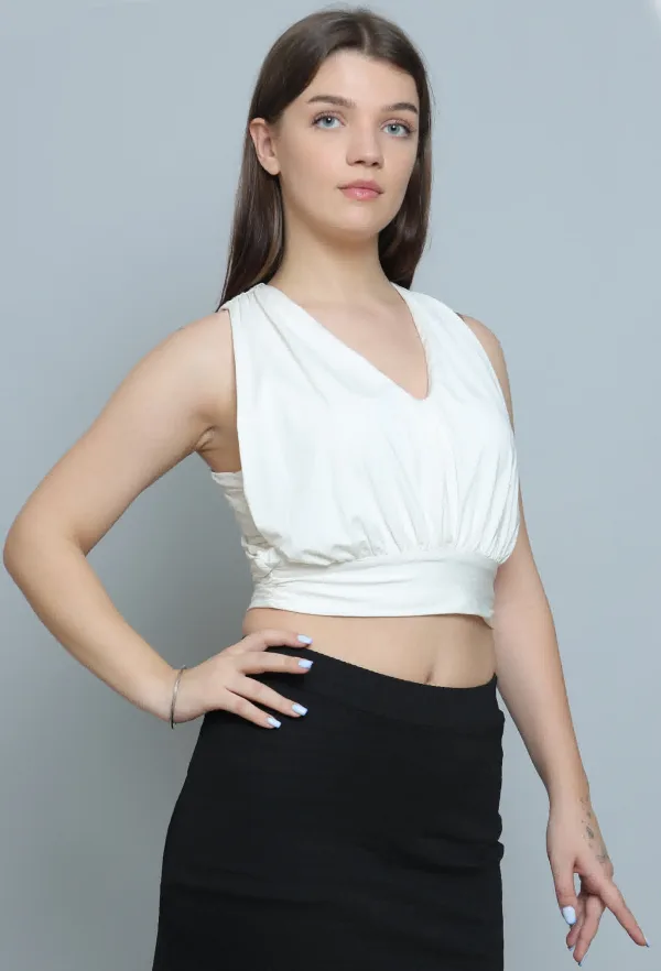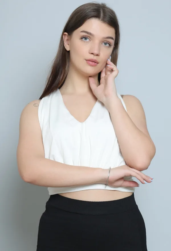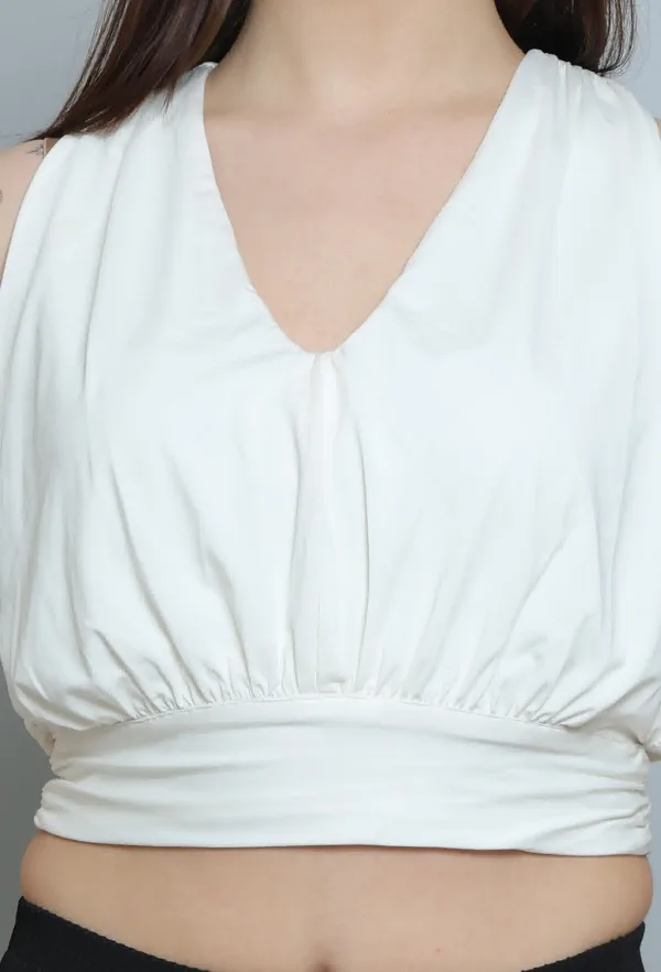 This Off-white Draped Style Top offers a chic and sophisticated touch to your wardrobe. Crafted from soft, flowy fabric, it features a unique draped design that creates a relaxed yet elegant silhouette. The off-white hue adds a timeless and versatile appeal, making it easy to pair with a variety of outfits. With its loose fit and stylish asymmetrical draping, this top flatters all body types and is perfect for both casual and formal occasions. The round neckline and sleeveless design add to its minimalist charm, making it a refined choice for effortless, everyday elegance.