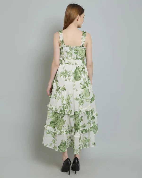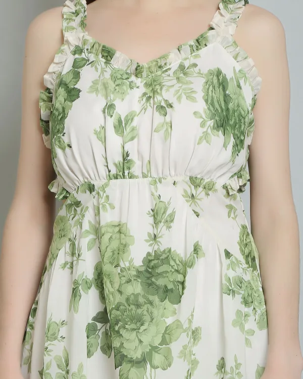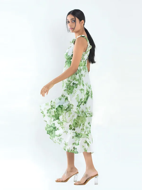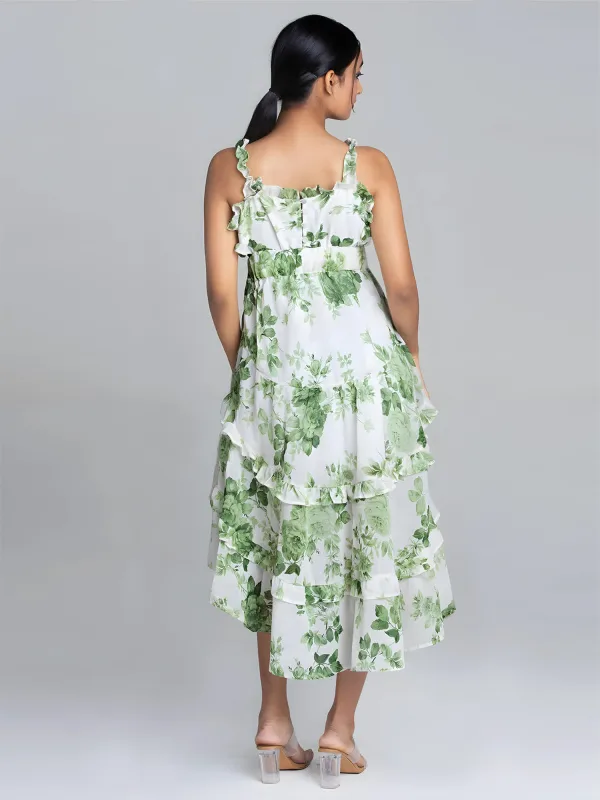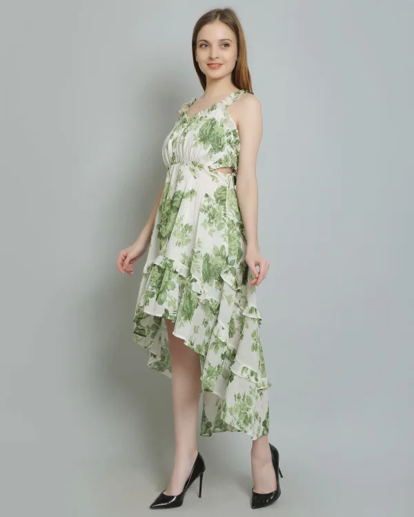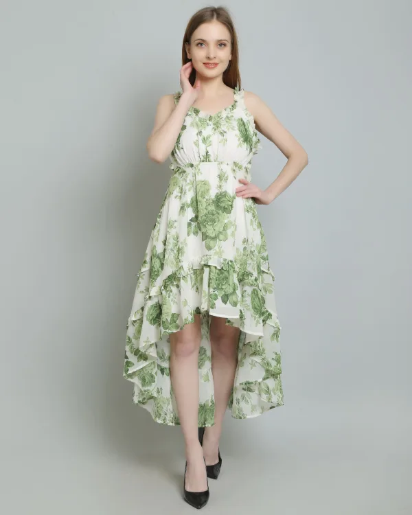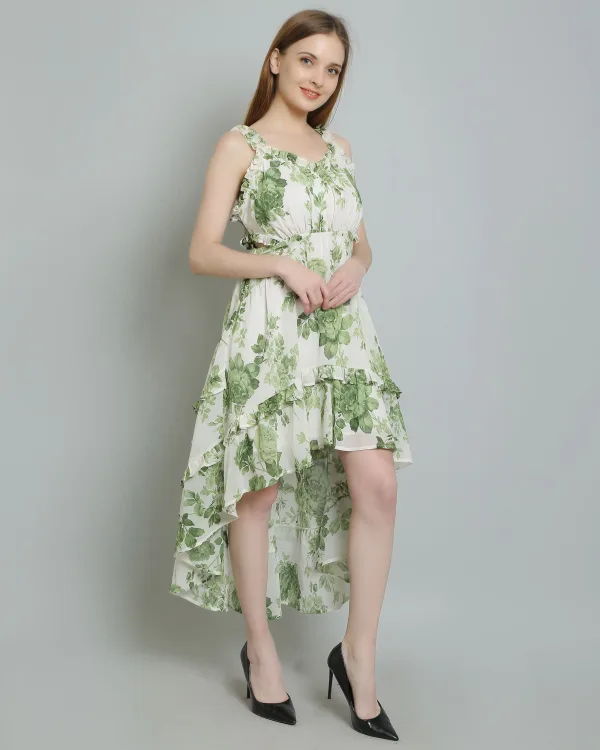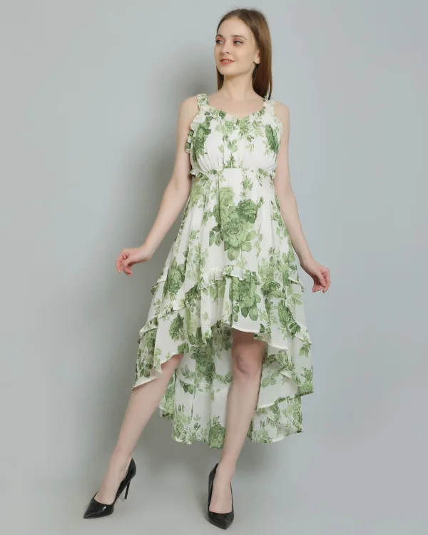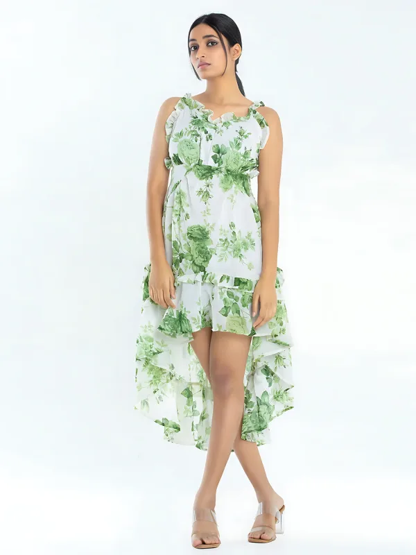 Details include a floral print, high-low design, and ruffle details, along with button fastening at the center back. The attached lining, ruffle neckline, and elasticated back waist belt add to its appeal, making it a stunning choice for any event. Don’t miss out on this beautiful ruffle dress for women—add it to your collection today!