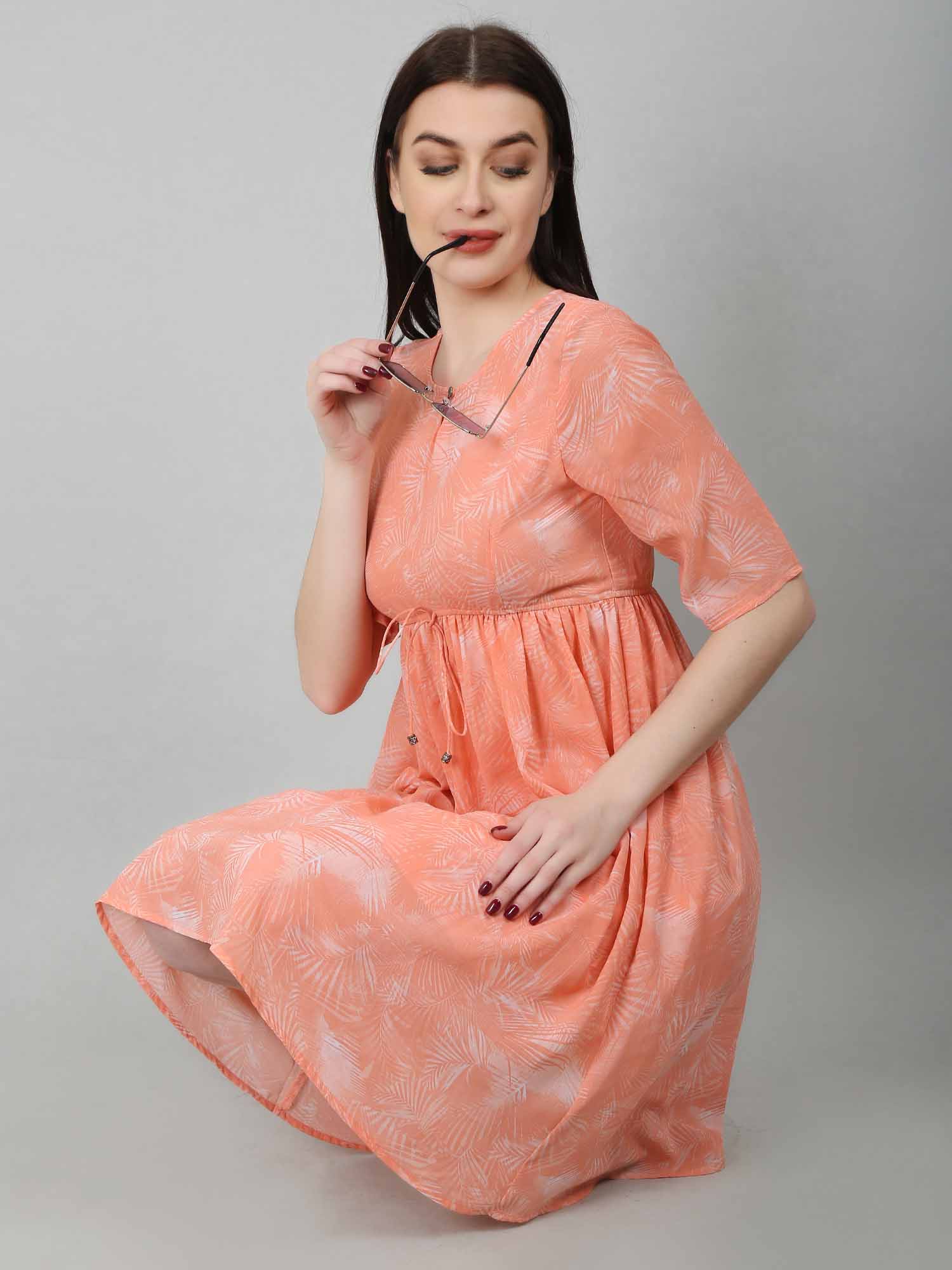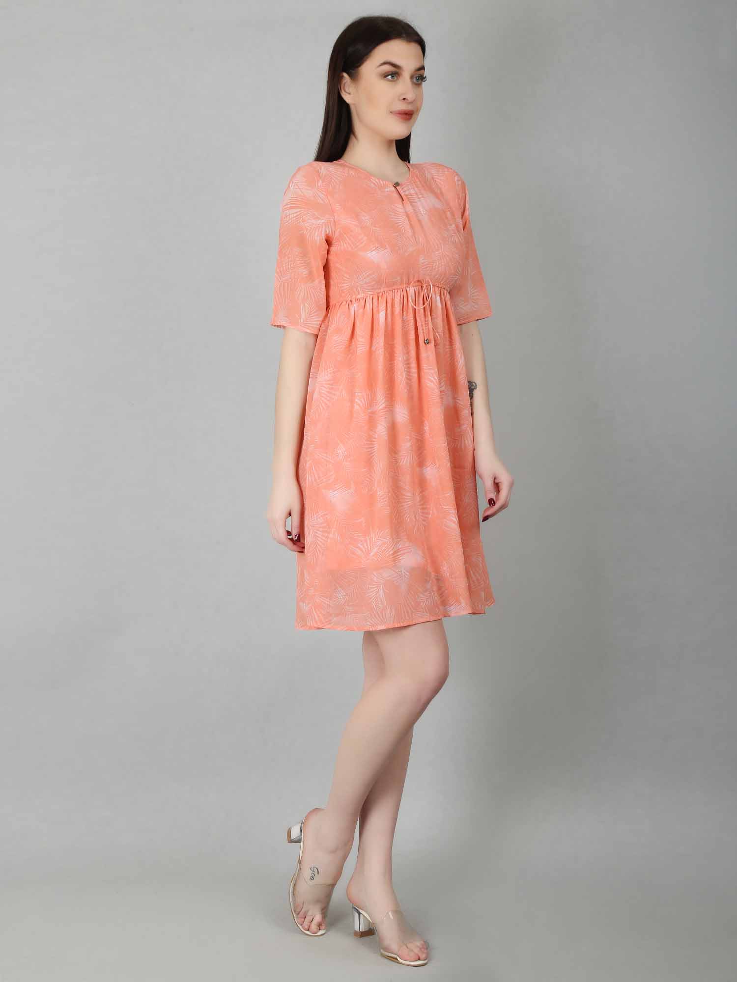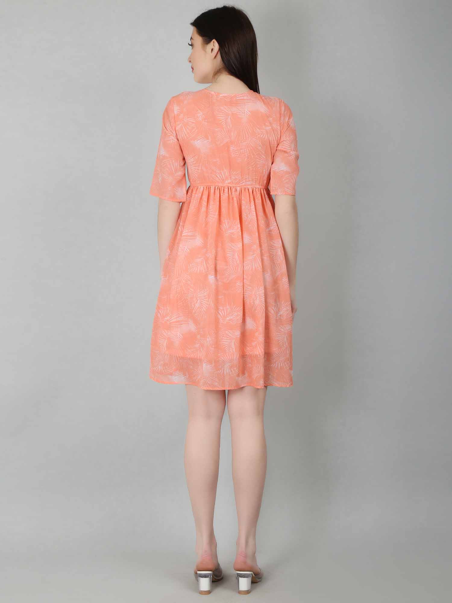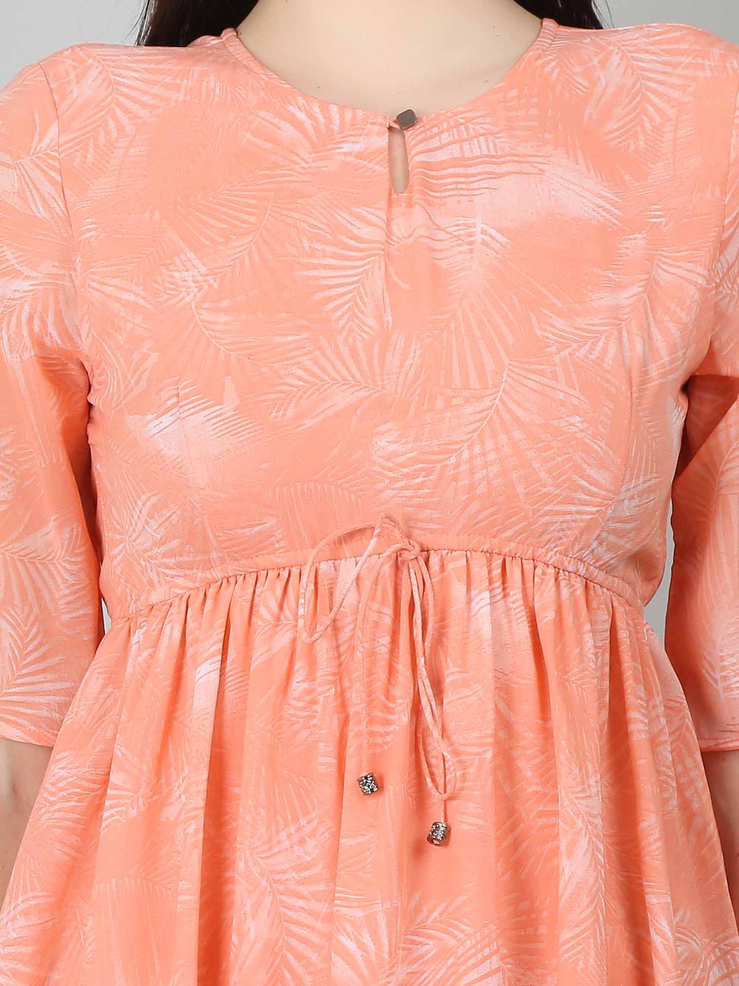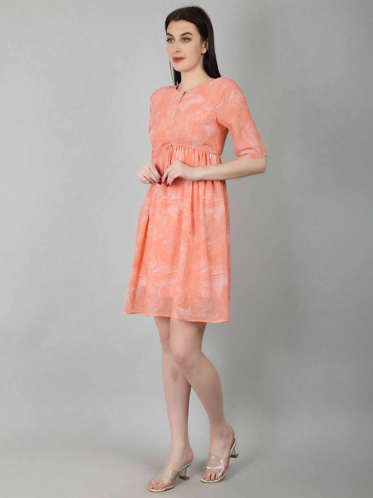 The Peach Tropical Fit & Flare Dress is a stylish and versatile option for various occasions. This fit and flare dress for women features a flattering silhouette with a fitted bodice and a flared skirt. The vibrant tropical print adds playfulness to the soft peach color, making it ideal for summer vacations or casual outings. Dress it up with heels and statement jewelry, or keep it casual with sandals and a denim jacket. With a front keyhole opening, elbow-length sleeves, and an elasticated waist for a cinched look, this peach dress is both comfortable and chic, complete with an attached lining for coverage.