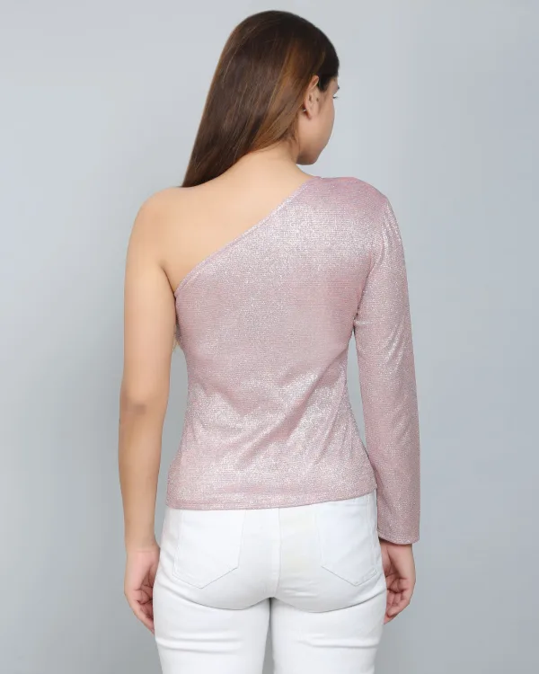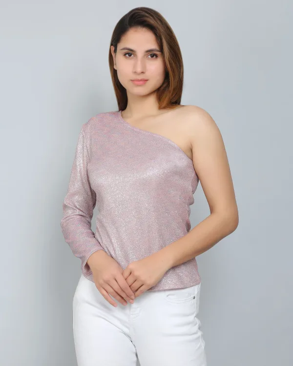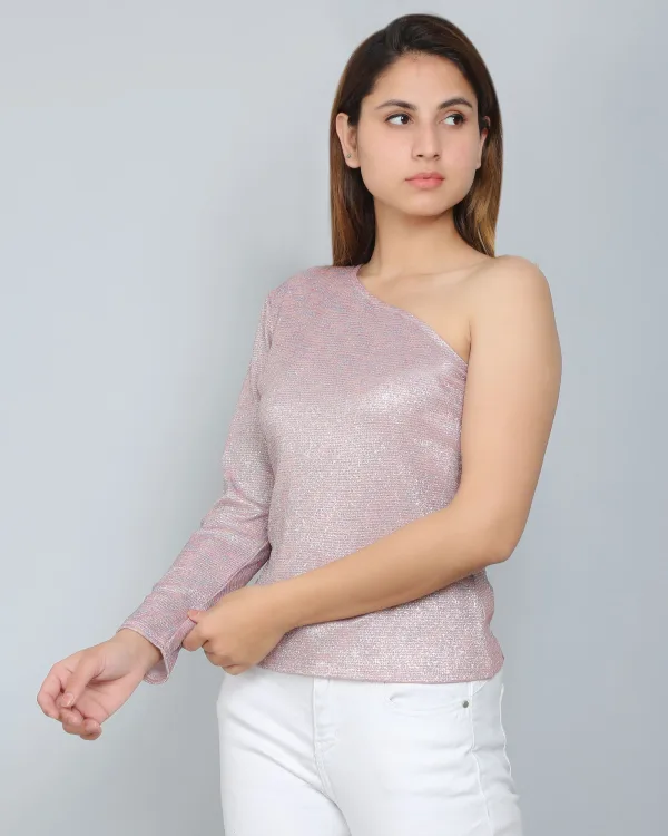 The Pink One-Shoulder Glitter Top is a bold and trendy statement piece, perfect for adding sparkle to any occasion. Featuring a striking one-shoulder design, this top showcases a modern silhouette with a flattering fit. The glittery fabric catches the light beautifully, creating a shimmering effect that exudes confidence and glamour. Its vibrant pink color adds a fun, playful vibe, making it ideal for parties, night outs, or special events. Comfortable and chic, this top pairs effortlessly with jeans, skirts, or tailored pants for a show-stopping look that transitions seamlessly from day to night.