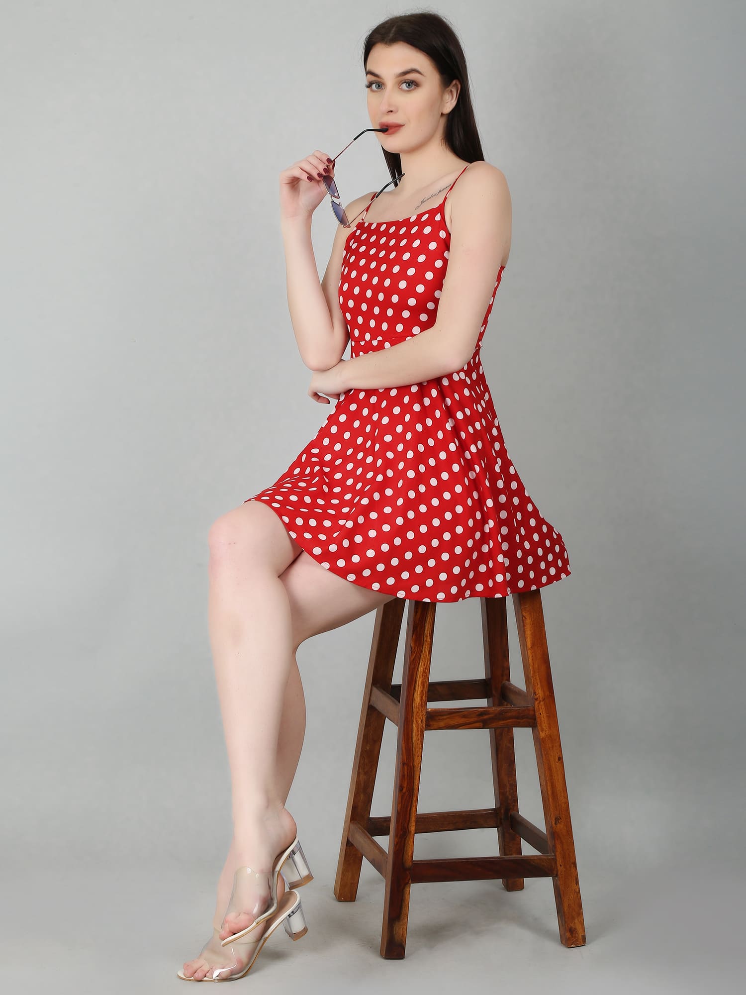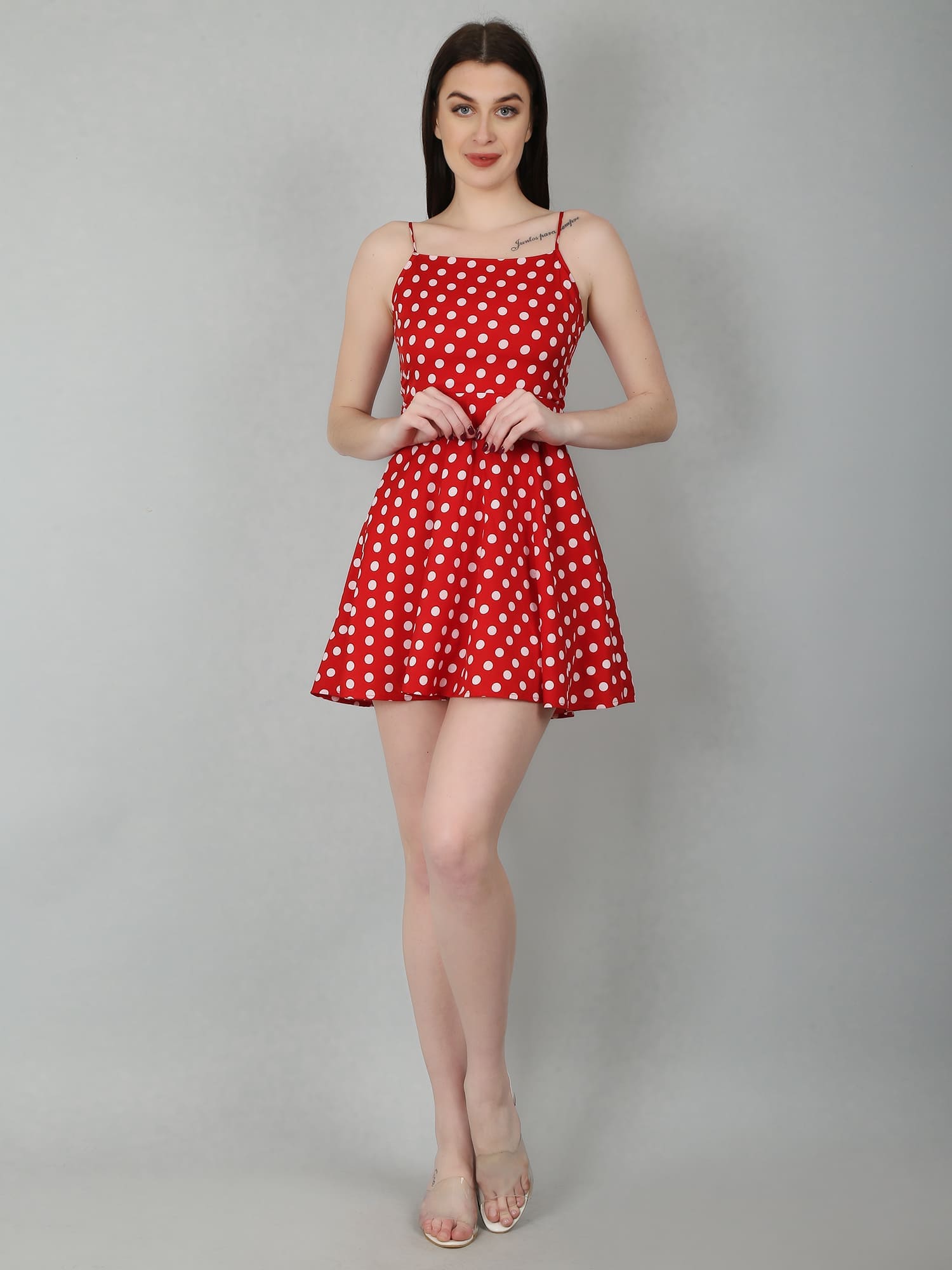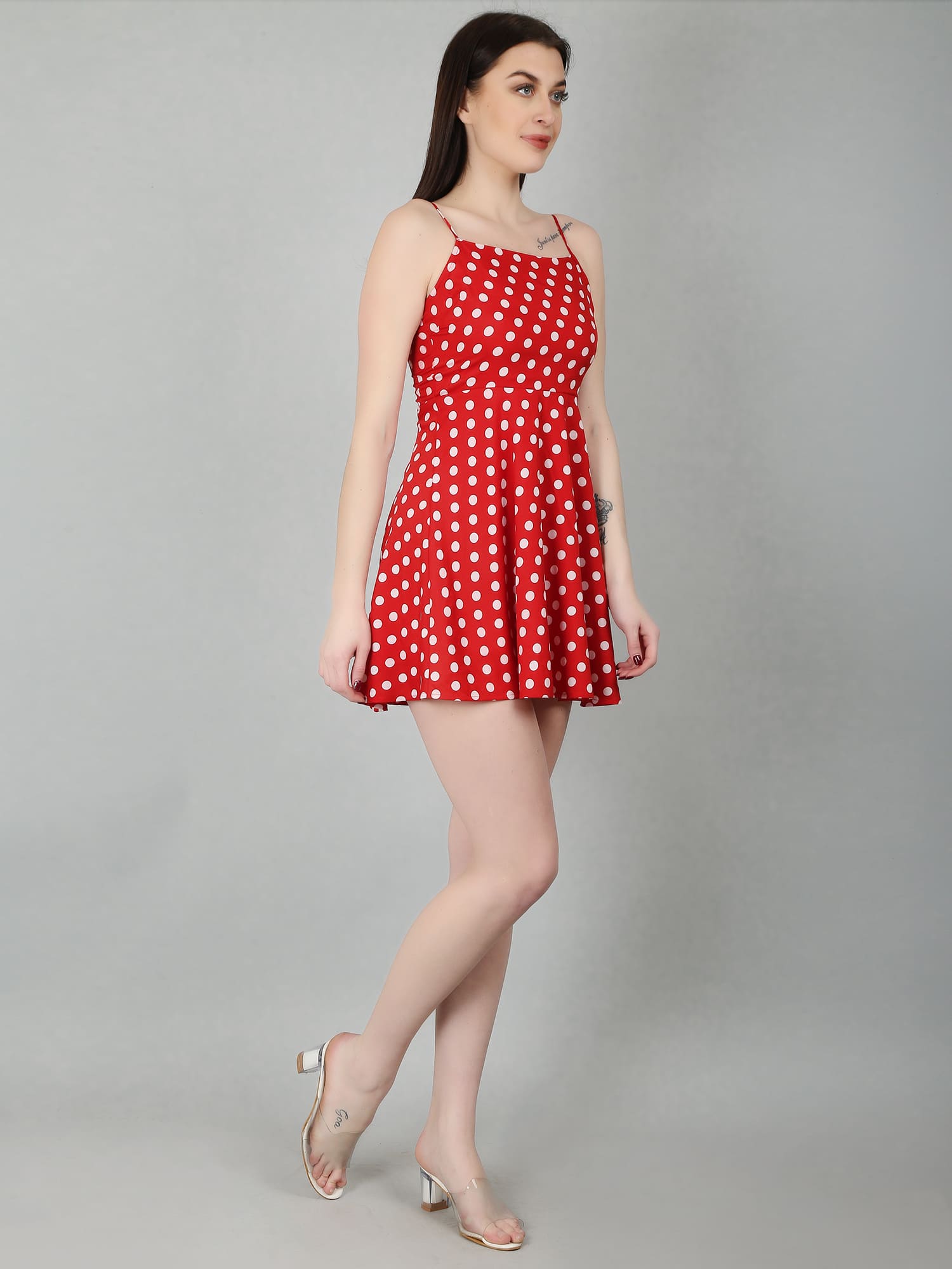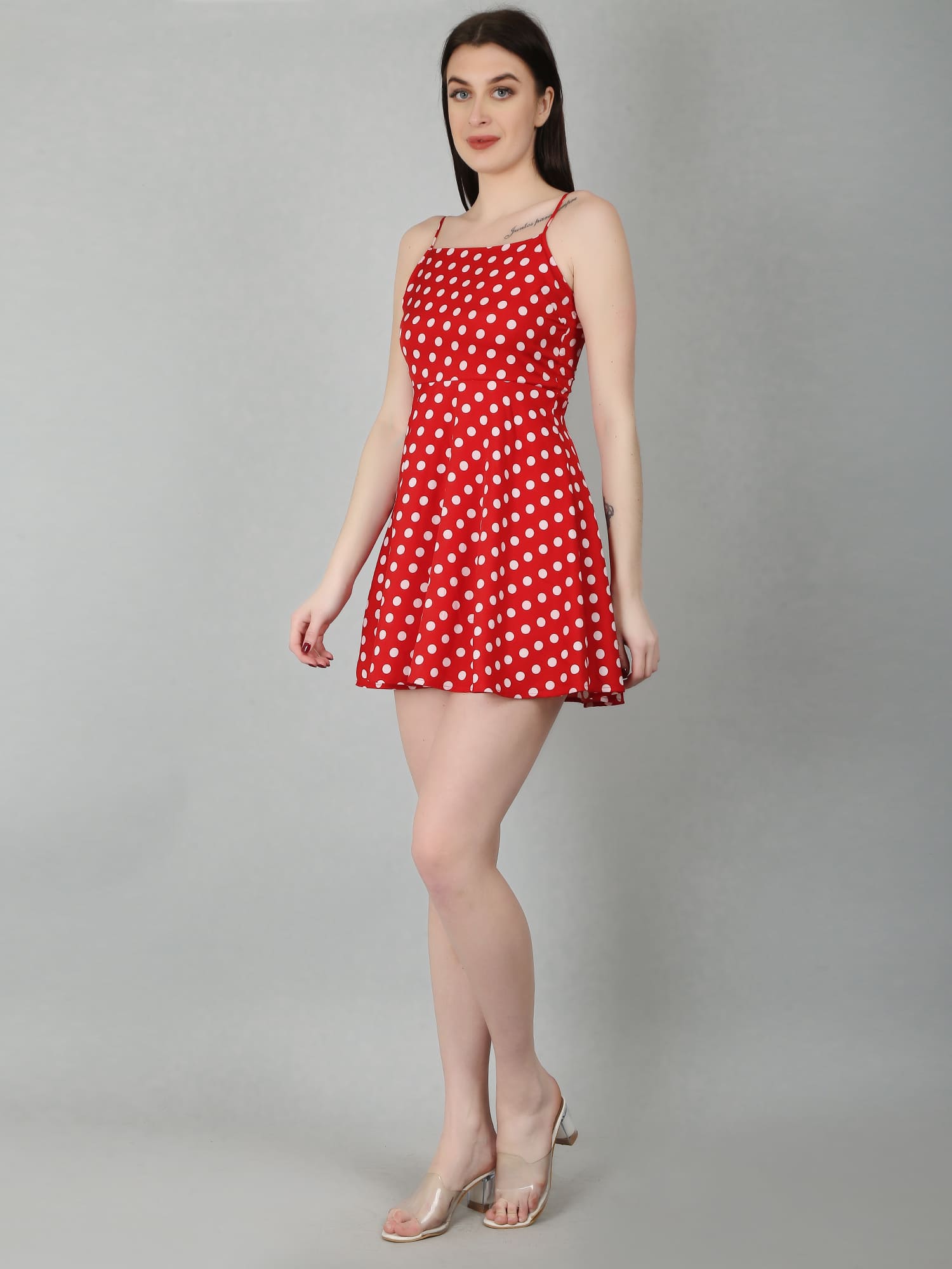 The Red Polka Fit & Flare Mini Dress is a playful and stylish red dress that adds charm to any wardrobe. Its flattering fit and flare silhouette hugs the bodice and flares into a mini skirt, creating a look that suits all body types. The bold red color and fun polka dot print make it an ideal polka dot dress, perfect for summer picnics, parties, or casual outings. This versatile dress for women can be dressed up with heels and statement jewelry for a night out, or toned down with sneakers and a denim jacket for a casual day. Made from high-quality, comfortable materials, it features adjustable shoulder straps, an attached lining, a fitted waist, and a flared hem for added ease and a flattering shape. Overall, the Red Polka Fit & Flare Mini Dress is a confident, whimsical choice for anyone looking to stand out, with its vibrant color, fun print, and versatile design making it a must-have addition to your wardrobe.