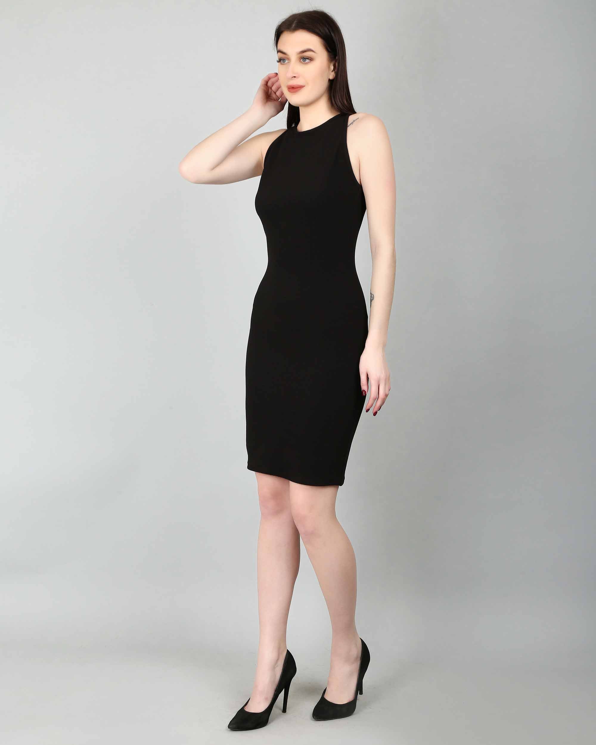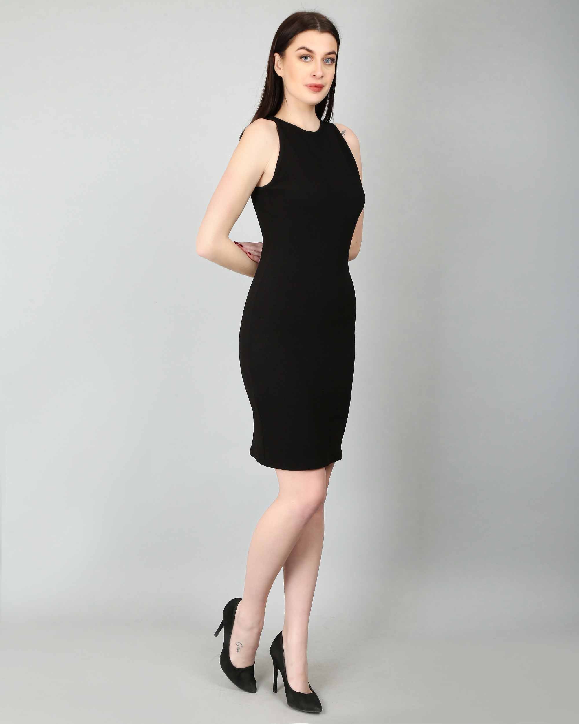 This simple yet elegant solid black knee-length dress has deep armhole curves to show off your shoulders and a concealed zipper at the back for the opening. Has a slit at the bottom of the centre back. This dress has a bodycon fit.