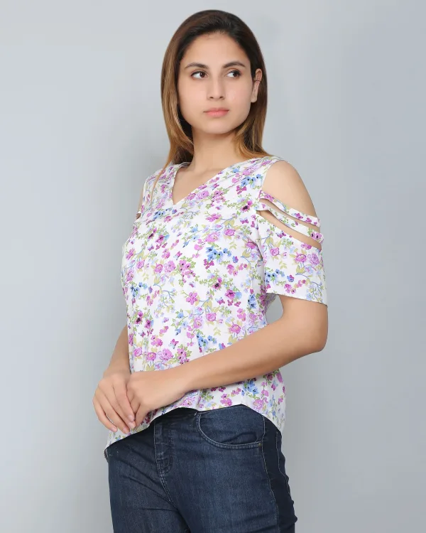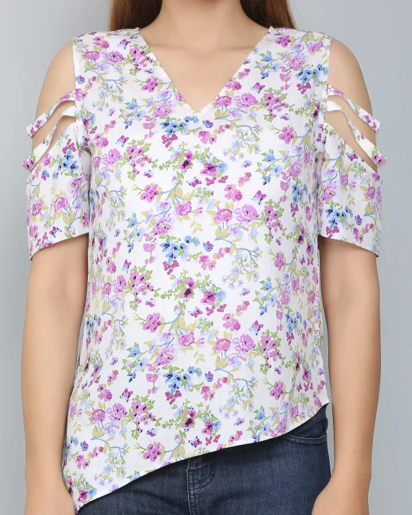 The fabric is lightweight and comfortable. The white floral print on this top is fresh and attractive. I love the cut out sleeve design most.