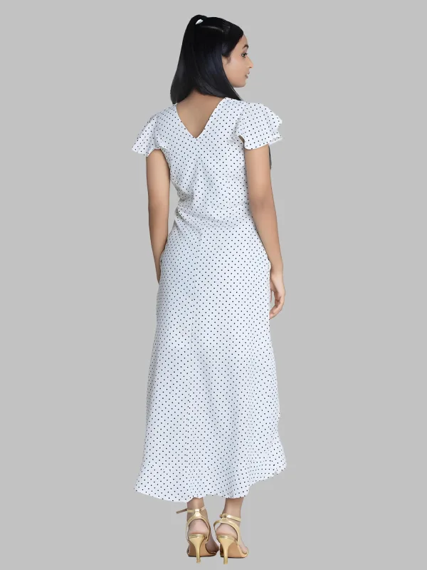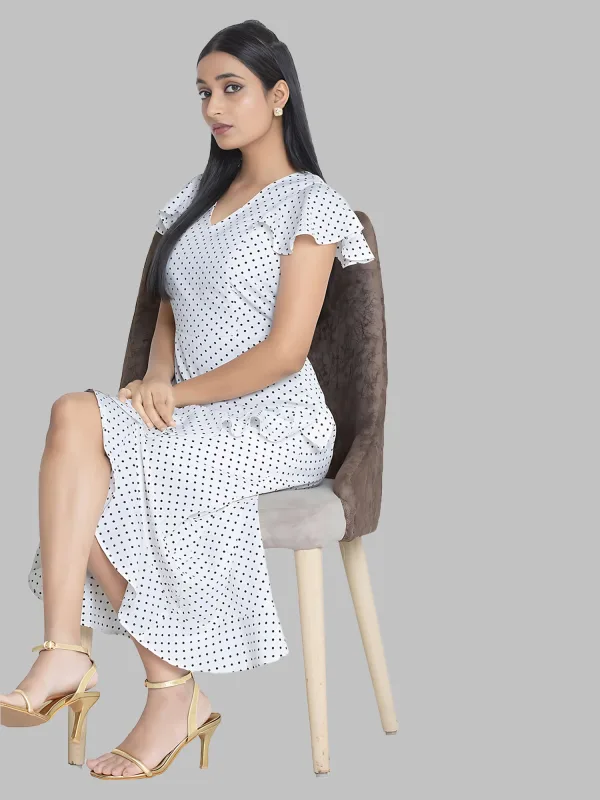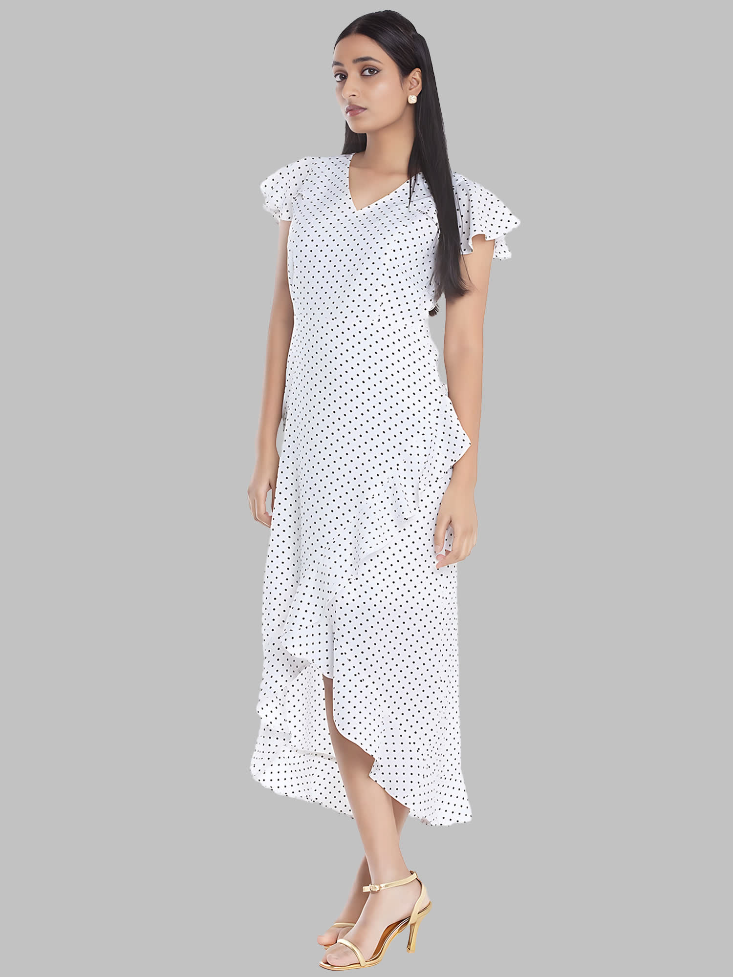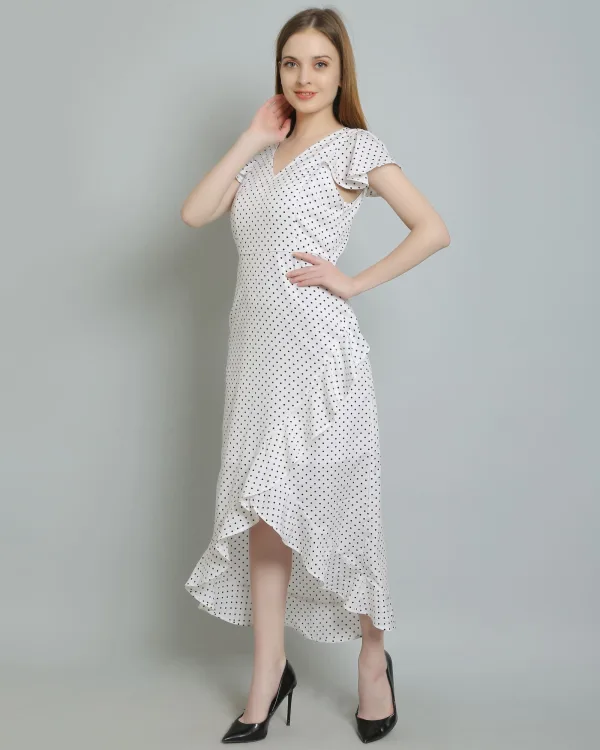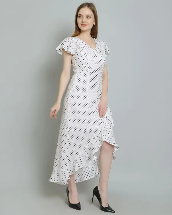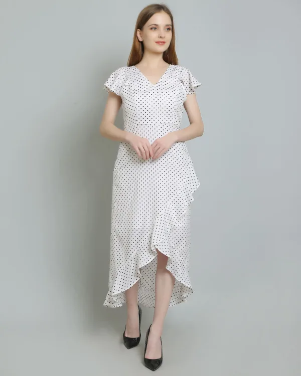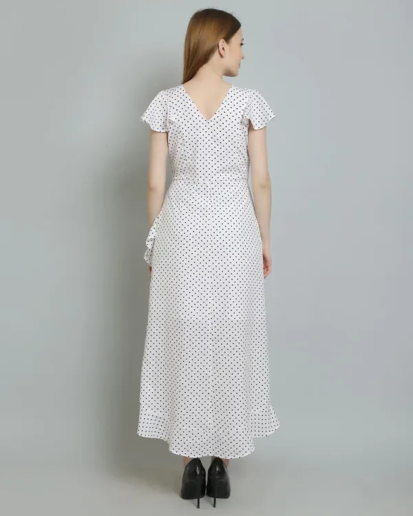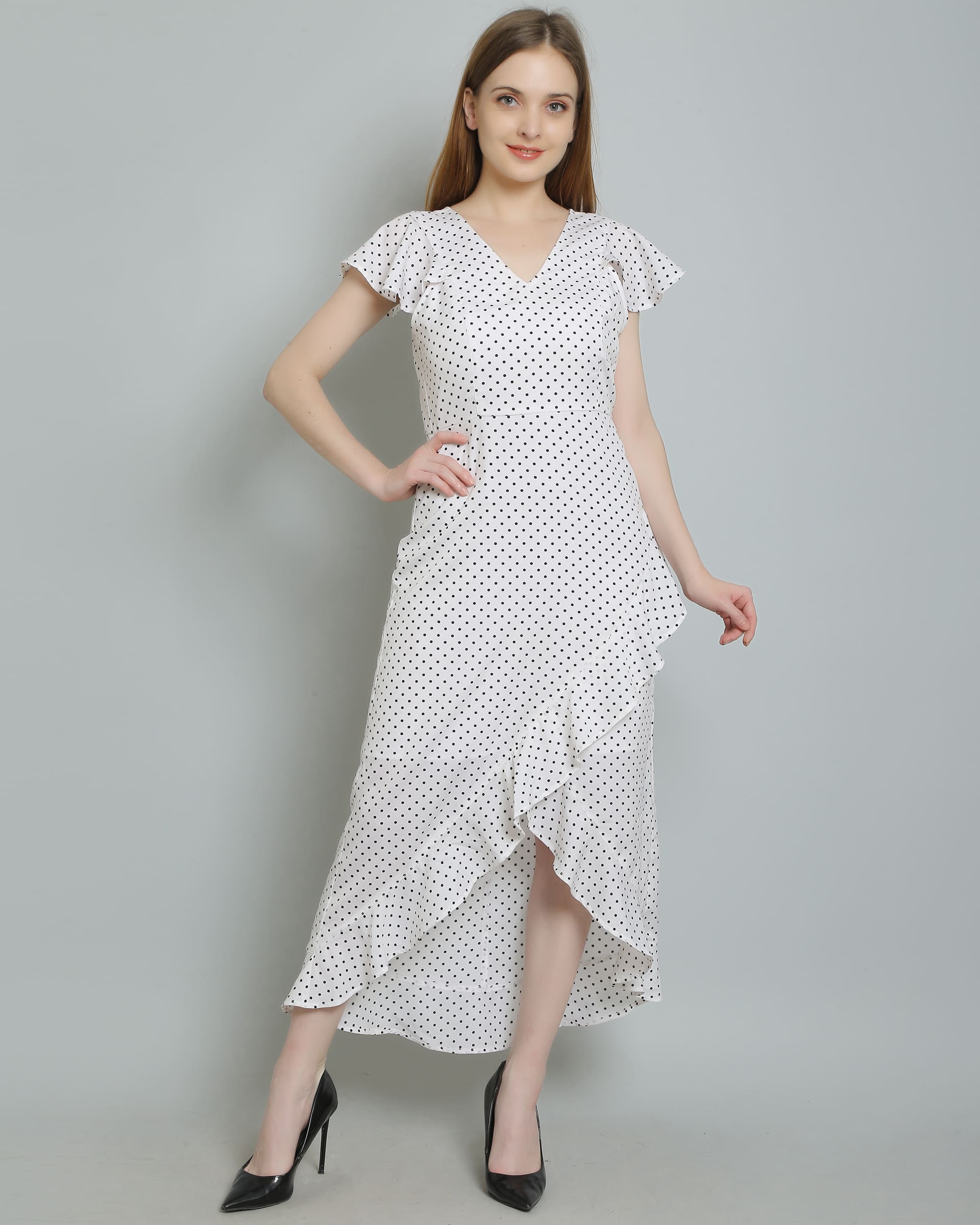 Whether you're pairing it with strappy sandals for a relaxed daytime look or dressing it up with heels and statement jewelry for an evening affair, the White Polkadot Long Ruffle Dress is effortlessly chic. Its timeless design and playful pattern make it a staple in any fashion-forward wardrobe.