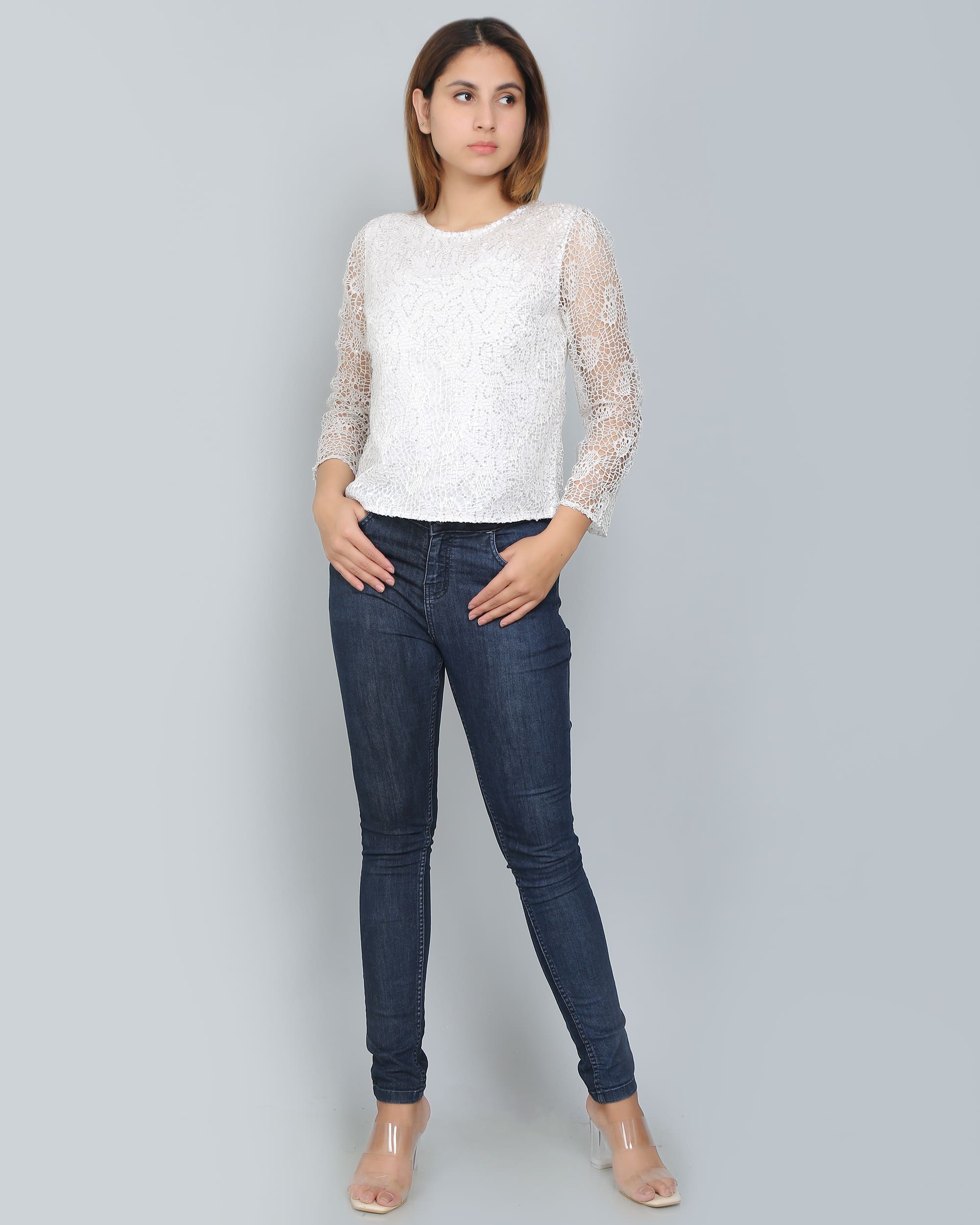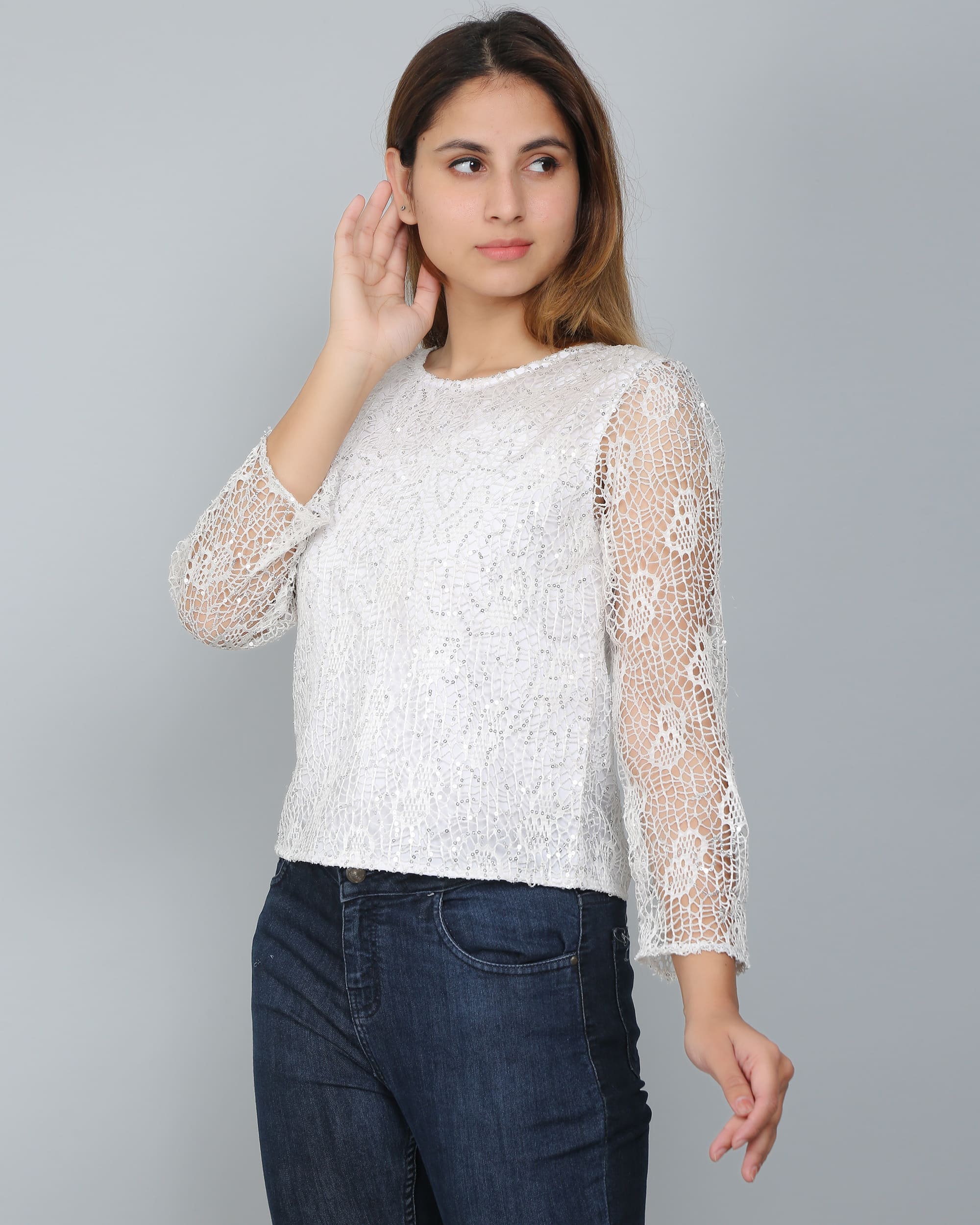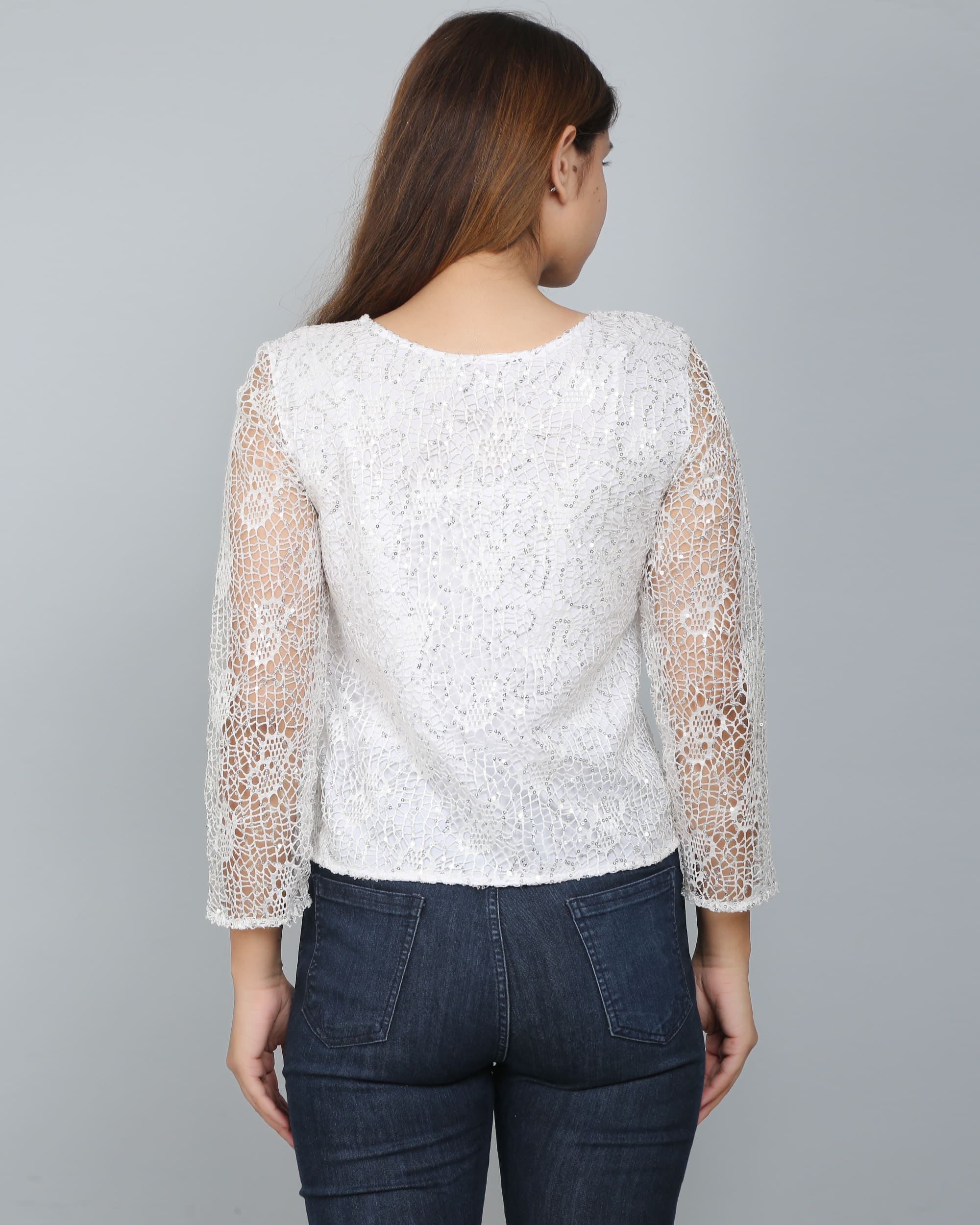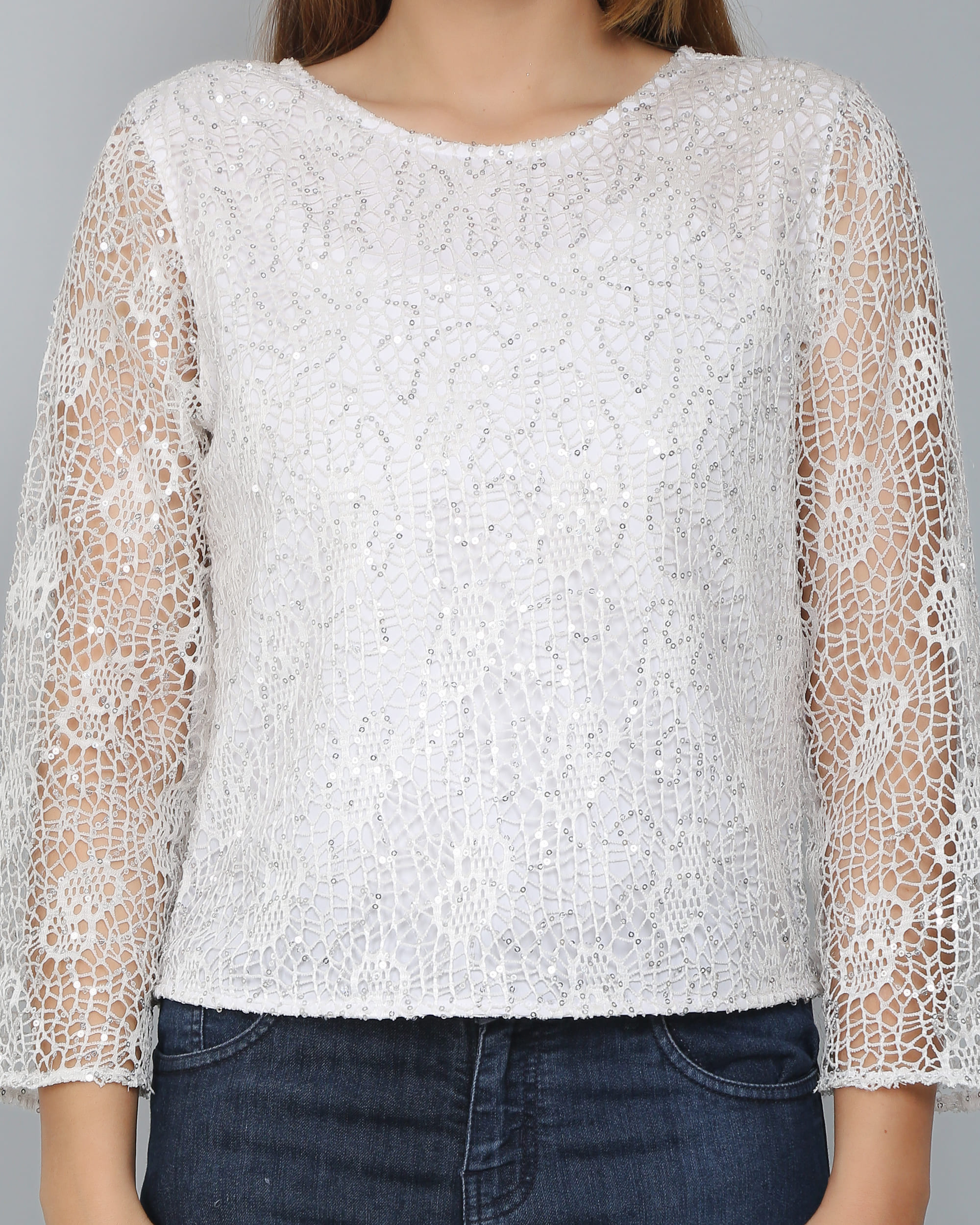 The White Sequin Embellished Lace Top is a delicate and elegant piece perfect for special occasions. Crafted from intricate lace, it is adorned with shimmering sequin embellishments that catch the light beautifully, adding a touch of glamour. The lightweight fabric offers both comfort and breathability, while the fitted silhouette and sheer sleeves provide a sophisticated look. Its versatile white hue makes it easy to pair with a variety of outfits, from formal skirts to tailored pants. This top effortlessly blends elegance and sparkle, making it an ideal choice for evening events or celebrations.