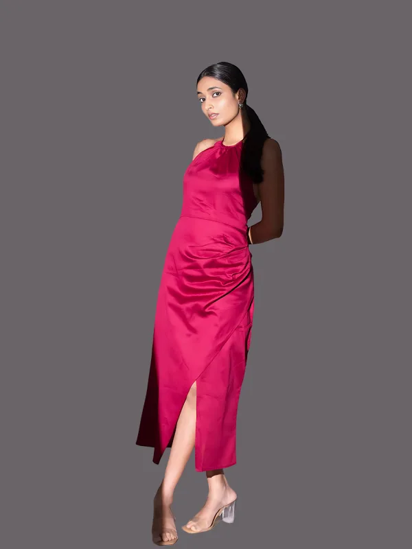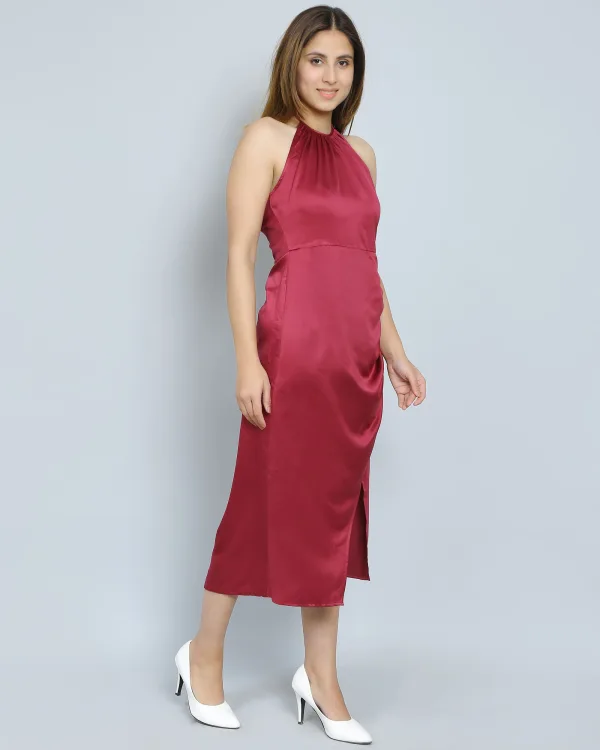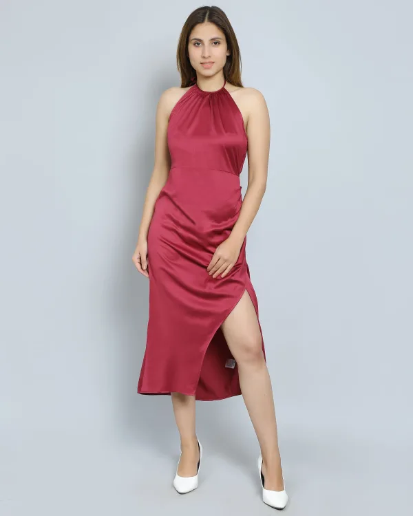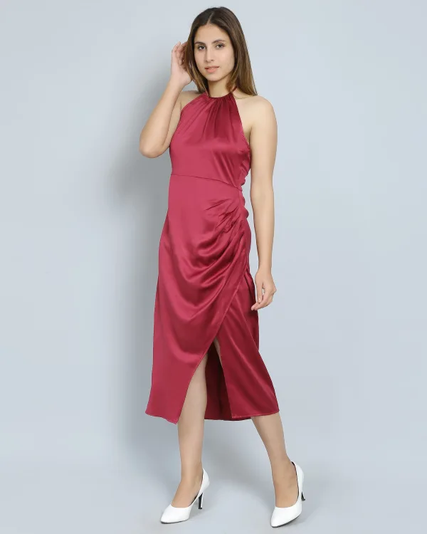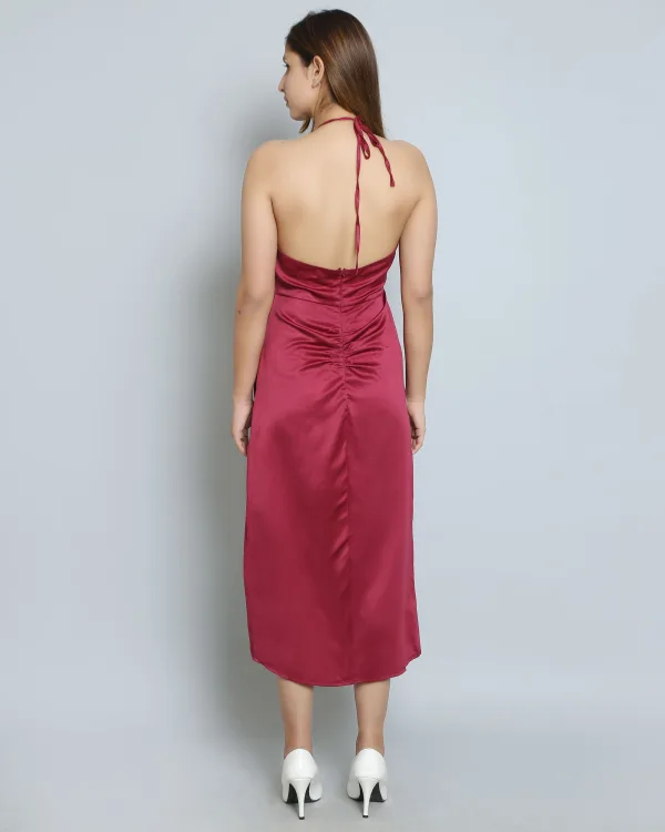 Crafted from satin, it showcases a solid wine color backless design with a pleated wrap-style bottom and a concealed zipper at the center back. The gathered neckline adds a sophisticated detail, and the slim fit ensures a flattering silhouette. Ideal for pairing with strappy heels and statement jewelry, this wine dress and halterneck dress is a must-have for any cocktail party look.