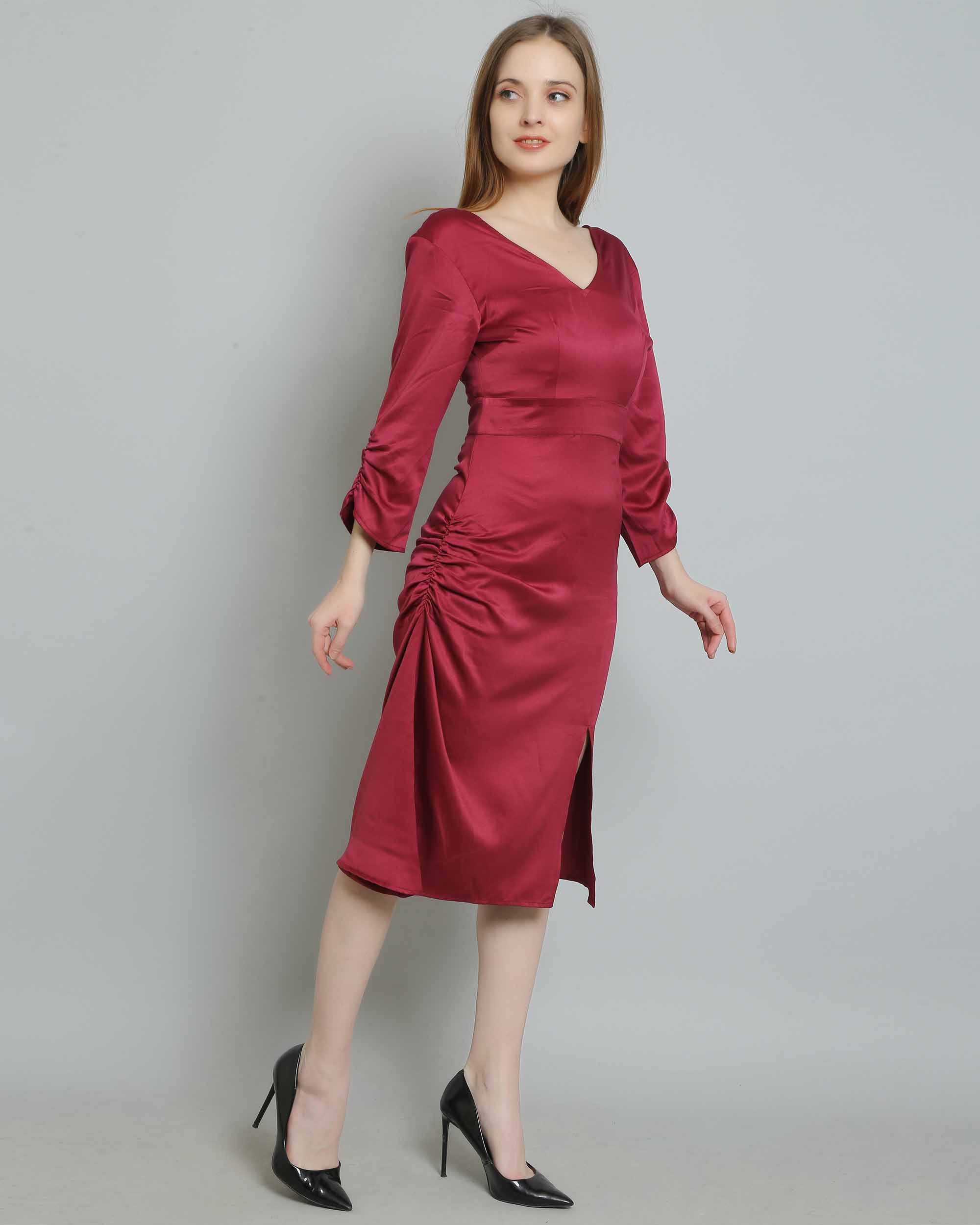 Introducing the Wine Satin Dress, a captivating piece that exudes sophistication and glamour. Perfect for a range of occasions, this dress is crafted from sumptuous satin fabric that drapes beautifully, giving you a luxurious feel with every wear. The rich wine color adds a touch of elegance, making it an ideal choice for evening events, cocktail parties, or special celebrations.