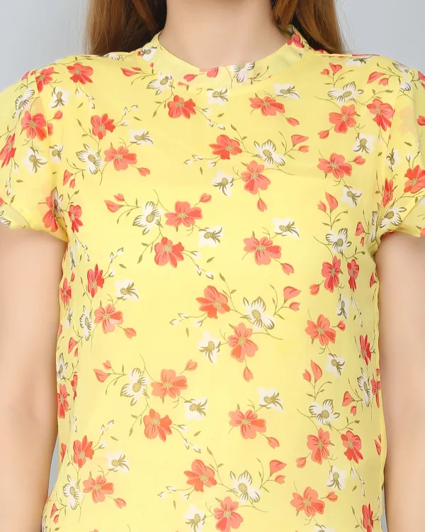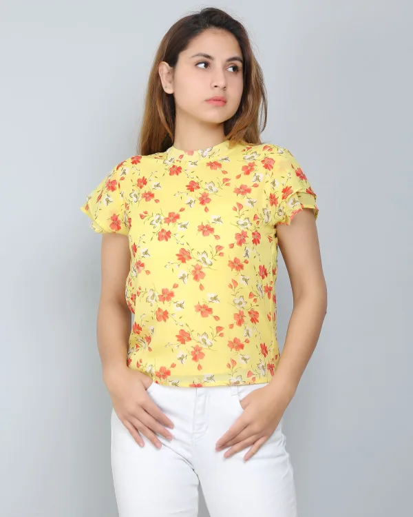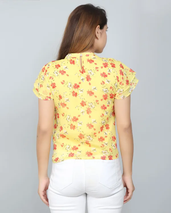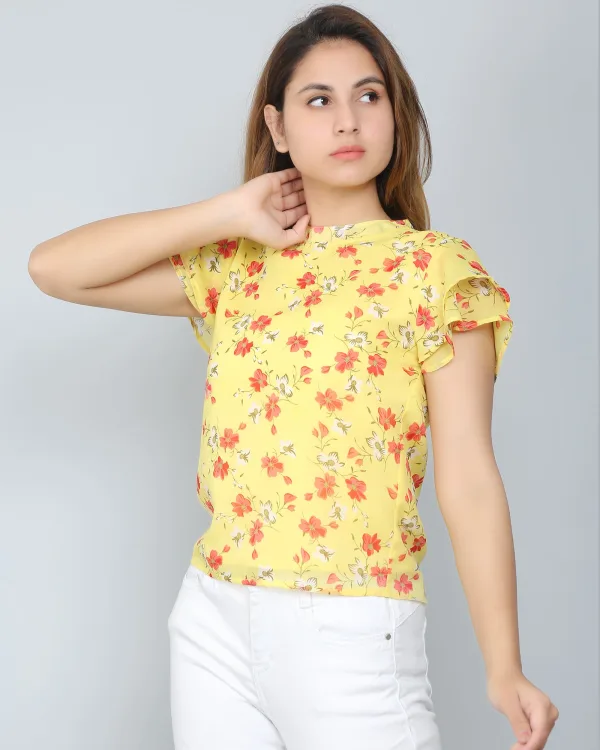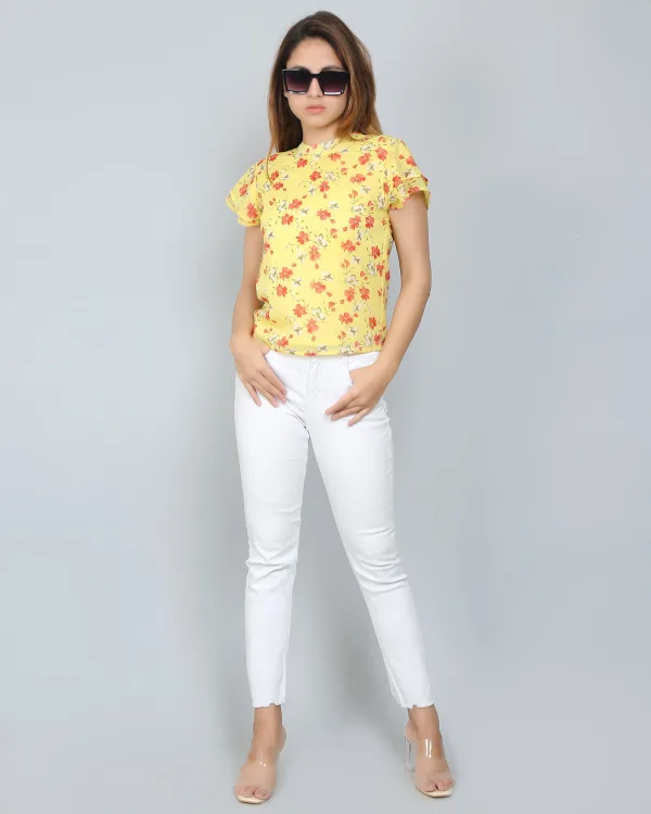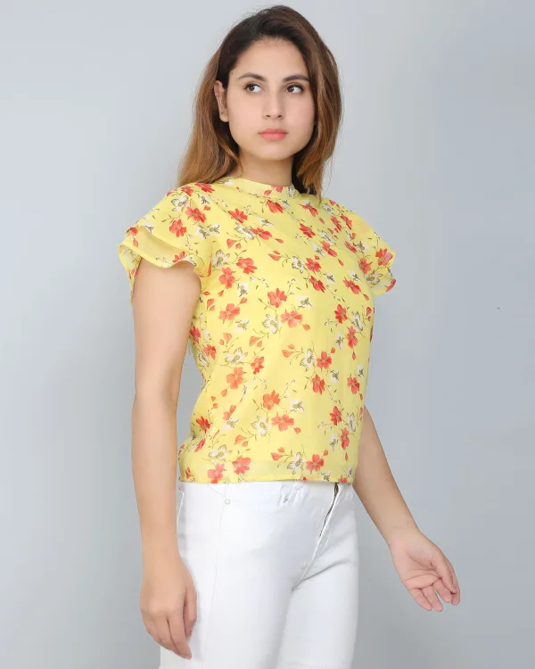 The quality of this yellow floral ruffle top is fantastic. The fabric is soft and durable, and the floral print remains vibrant even after multiple washes.