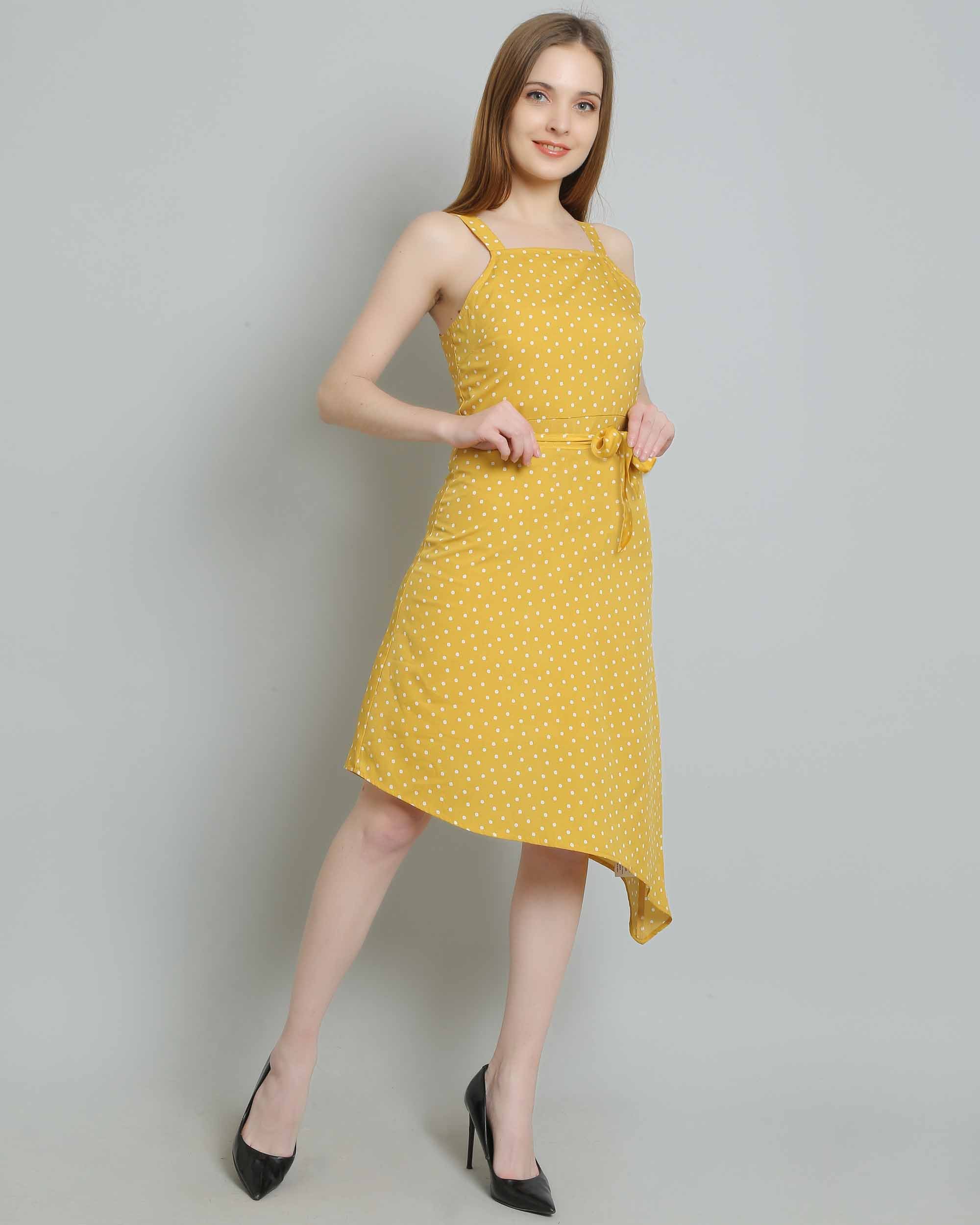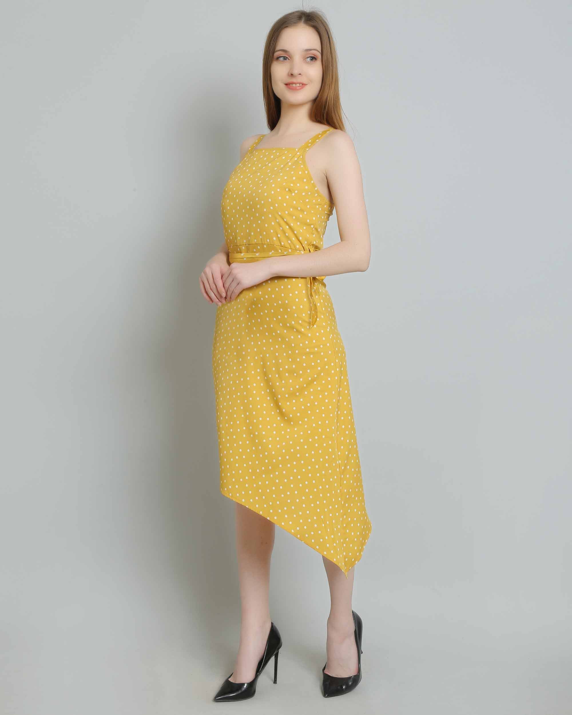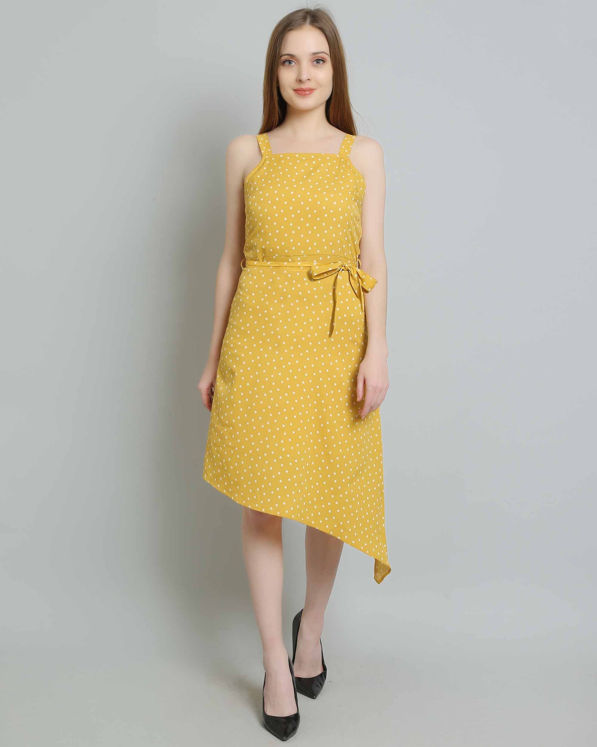Polkadot asymmetric hem above knee-length dress with shoulder straps and a removable belt made from the same fabric. It has an attached lining inside for an opaque look and concealed zipper fastening on the center back. This dress has a regular fit for casual occasion.