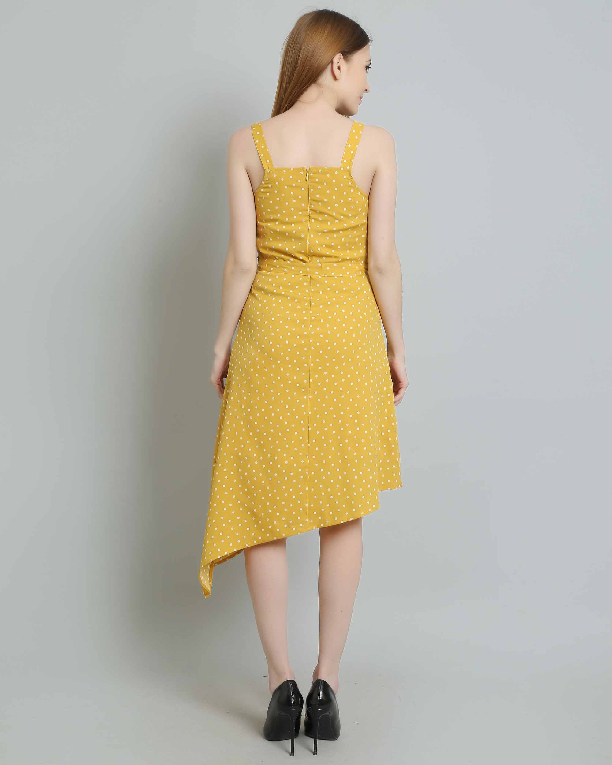 Designed for versatility, the Yellow Polka Dot Asymmetric Hem Dress can be dressed up or down with ease. Pair it with stylish sandals and a sun hat for a casual daytime look, or elevate your style with heels and statement jewelry for a night out. The sleeveless design and flattering neckline highlight your shoulders, making it an ideal choice for warm weather.